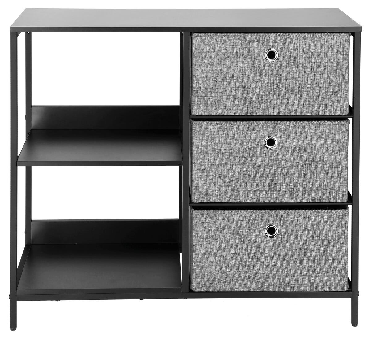 • Hylle i svart metall med 3 skuffer i grå tekstil.