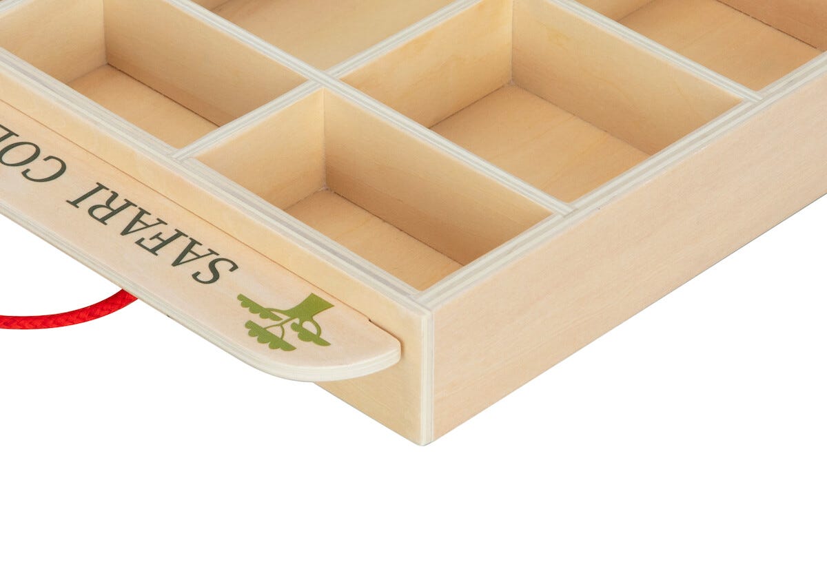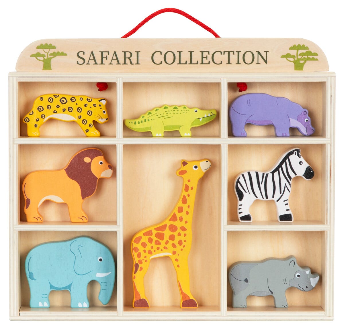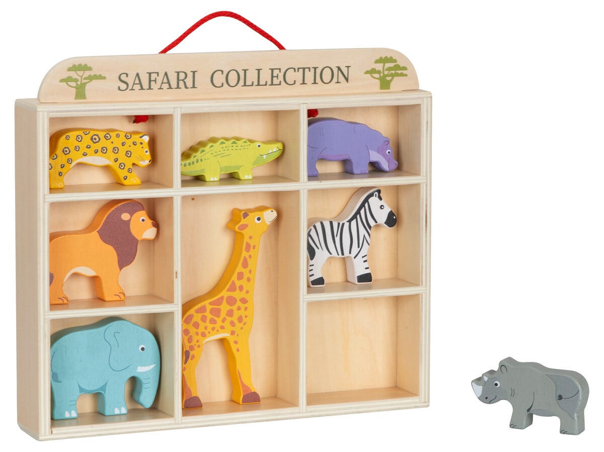 • Lekesett med safaridyr i tre – med hylle der dyrene kan oppbevares.