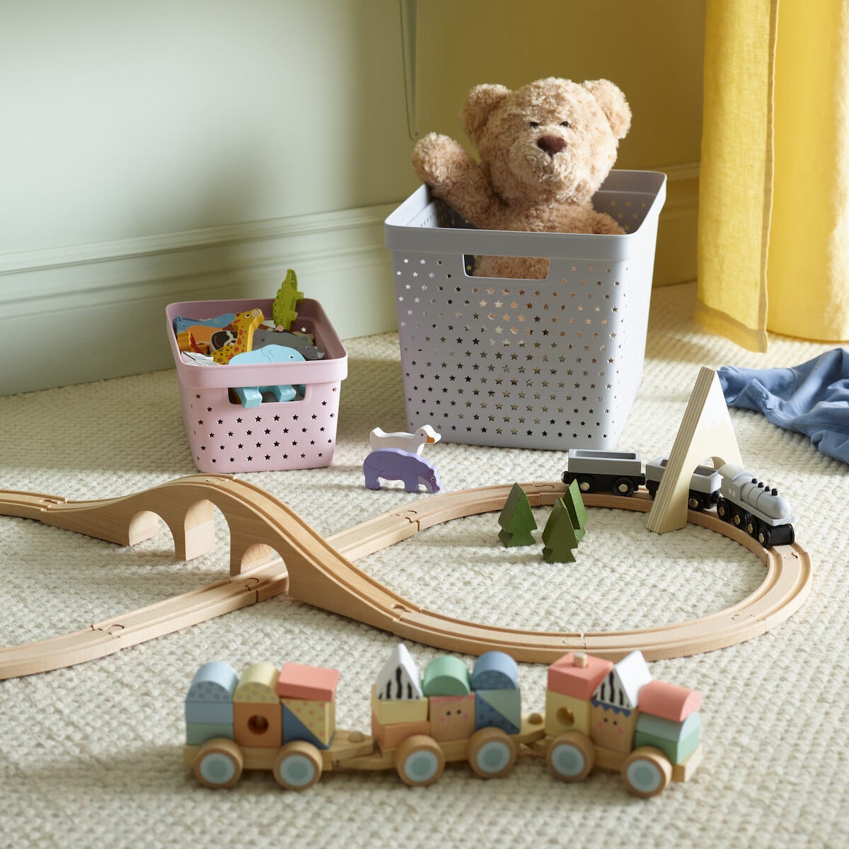 • Tog med treklosser – trener opp barns finmotorikk og følelse for form og farge.