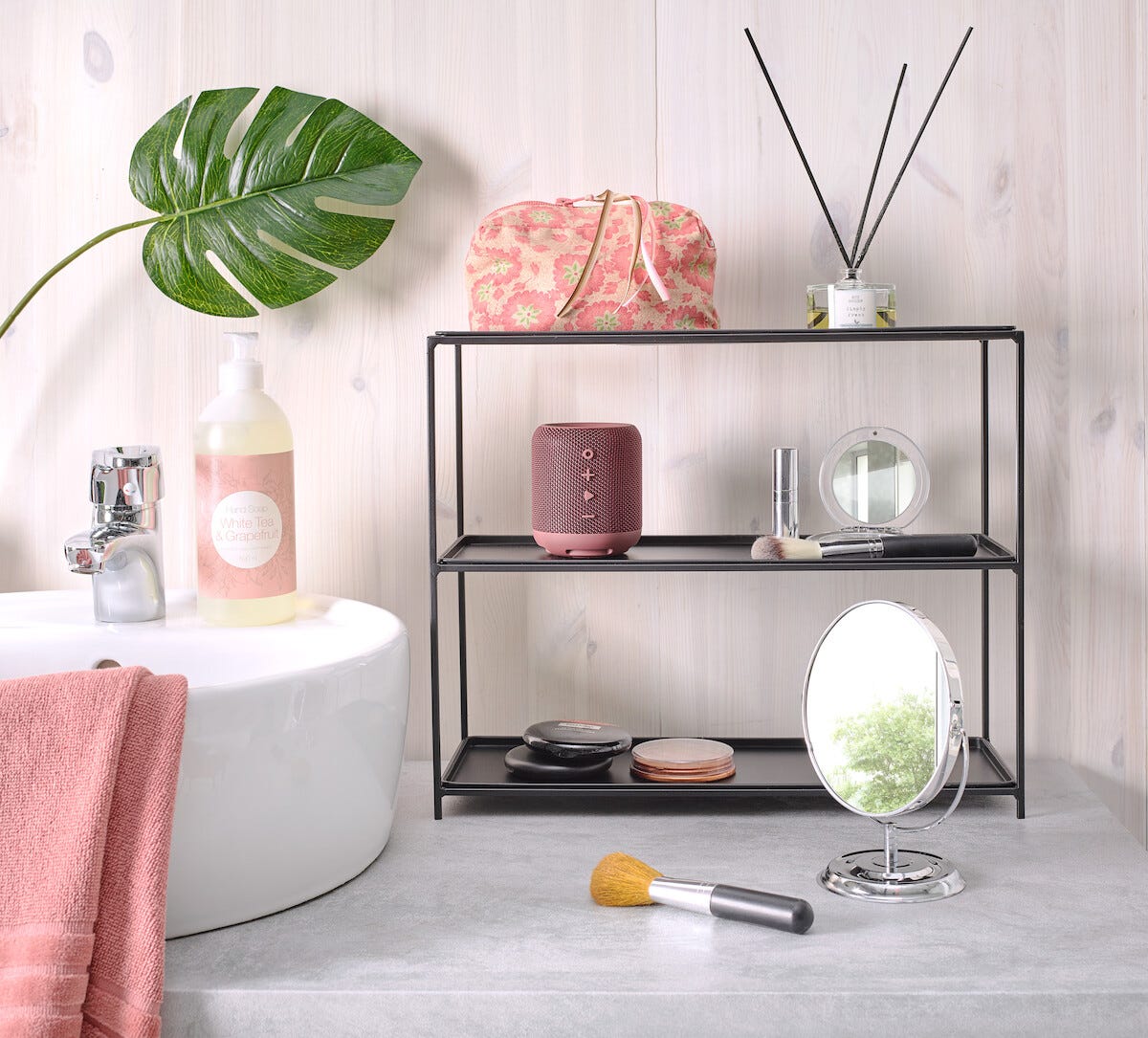 • Liten hylle i metall – praktisk til krydderglass, hudpleieprodukter eller småplanter.