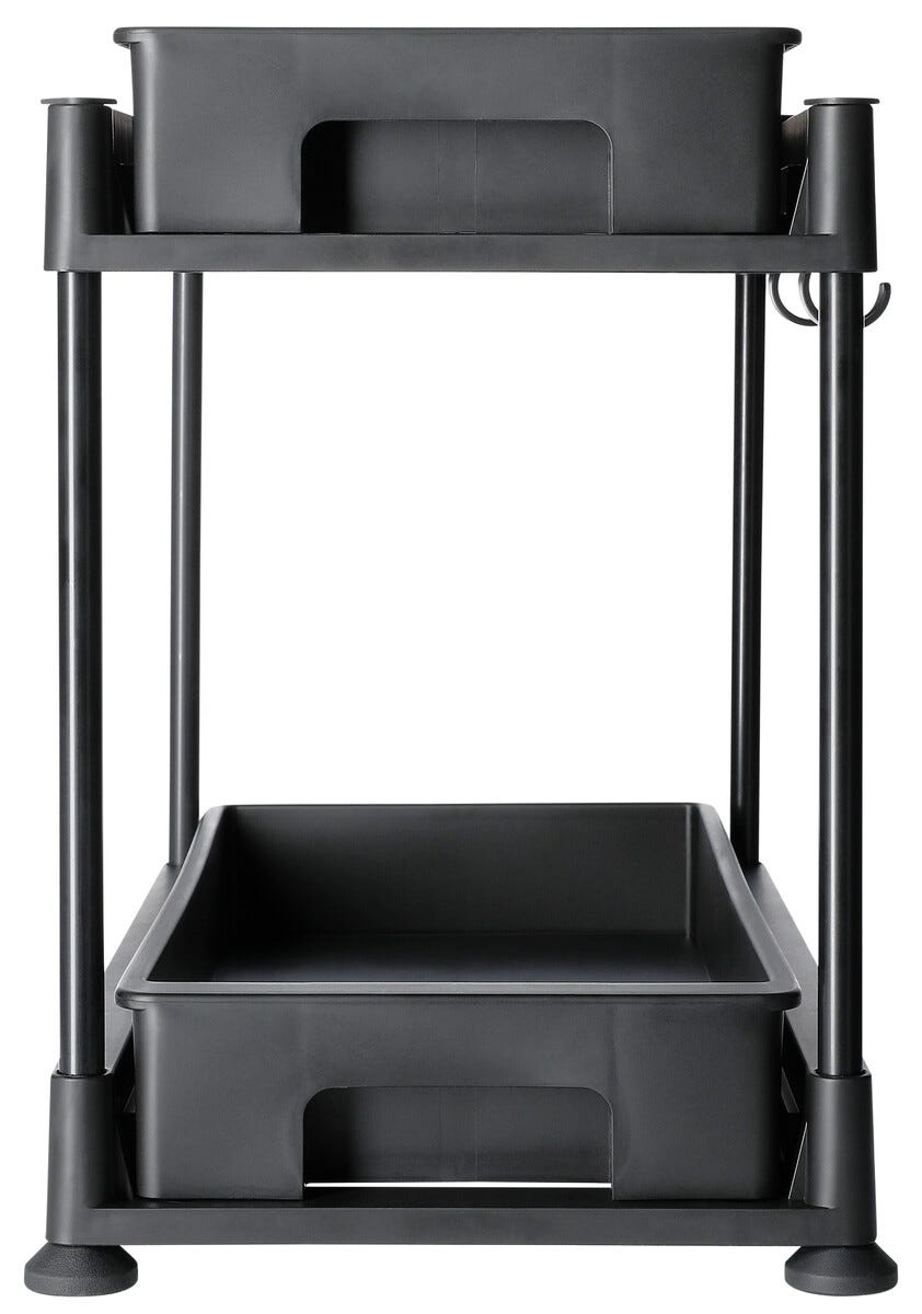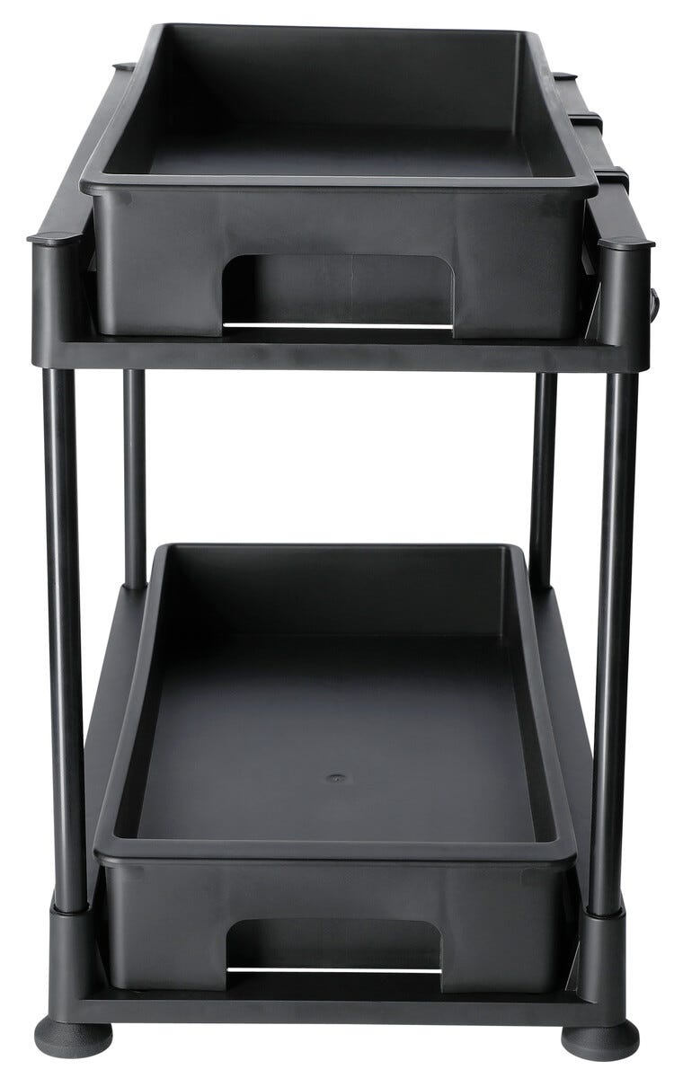 Liten plasthylle med utrekkbare skuffer for enkel oppbevaring.