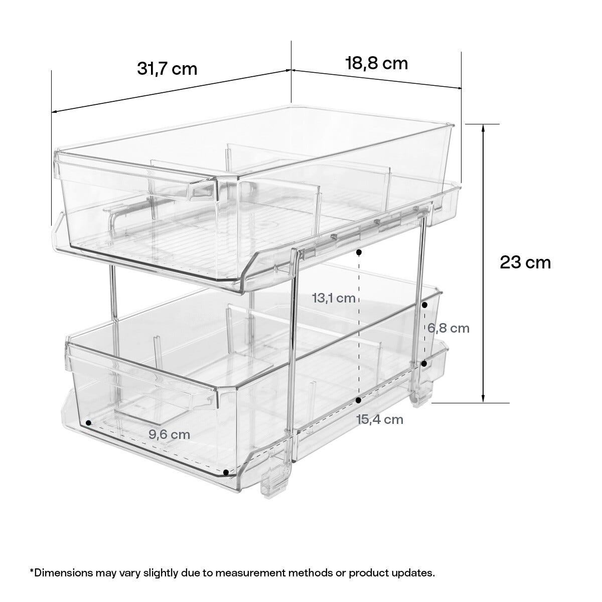 • Hylle med to uttrekkbare skuffer for praktisk oppbevaring av småting.