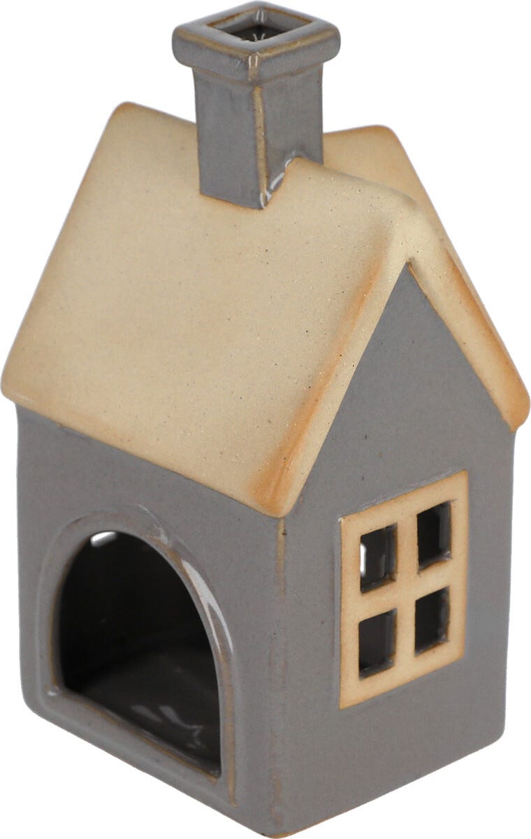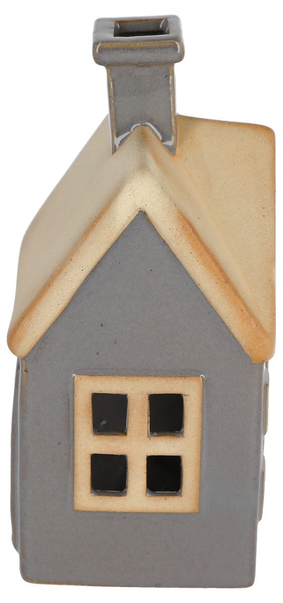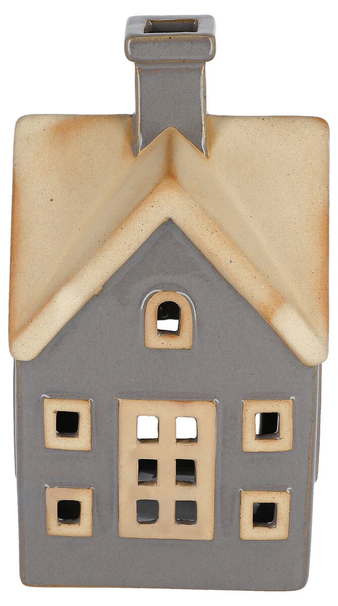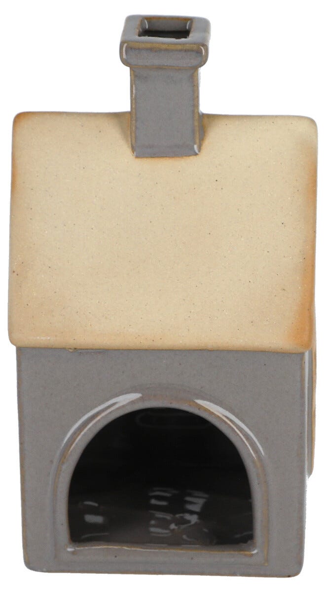 • Dekorasjonshus i keramikk, med grå vegger og brunt tak.