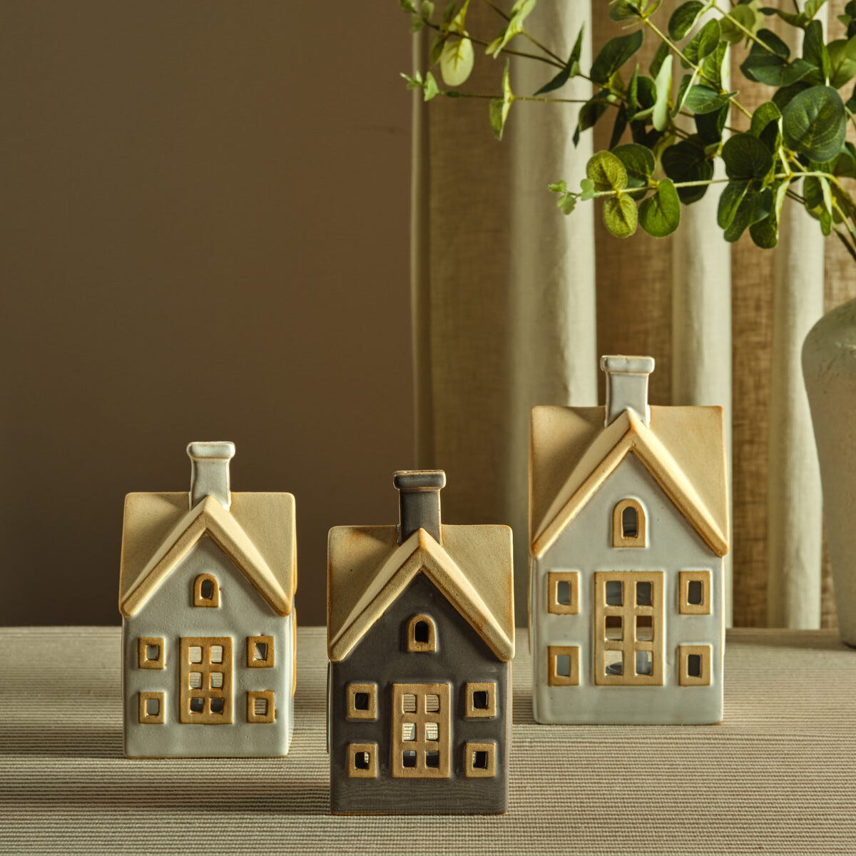 • Hus i keramikk for telys eller LED-lys – sprer et vakkert skinn gjennom vinduene.