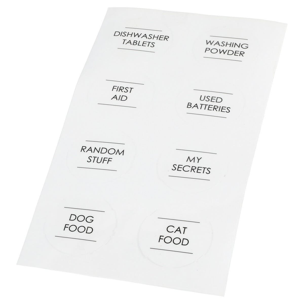 • Selvheftende etiketter: Dishwasher tablets, Washing powder, First aid, Used batteries, Random stuff, My secrets, Dog food, Cat food.