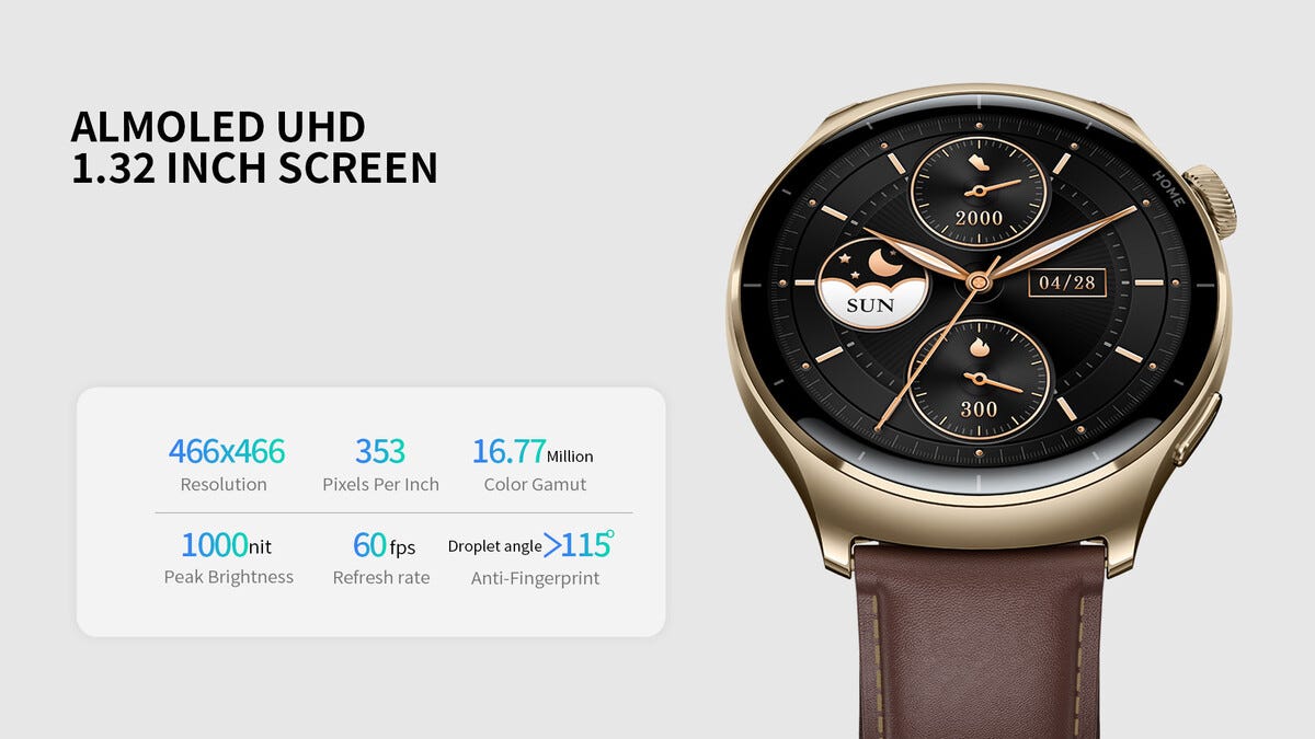 • Krystallklar AMOLED UHD-skjerm – lyssterk og skarp, selv i kraftig sollys.