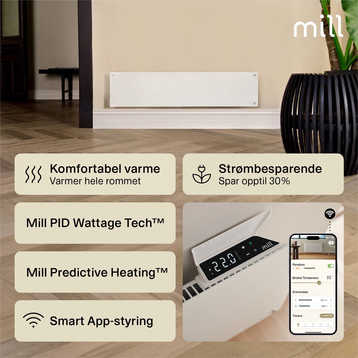 • Mill Glass Element Gen. 4 – smart panelovn med hvit glassfront (850 W).