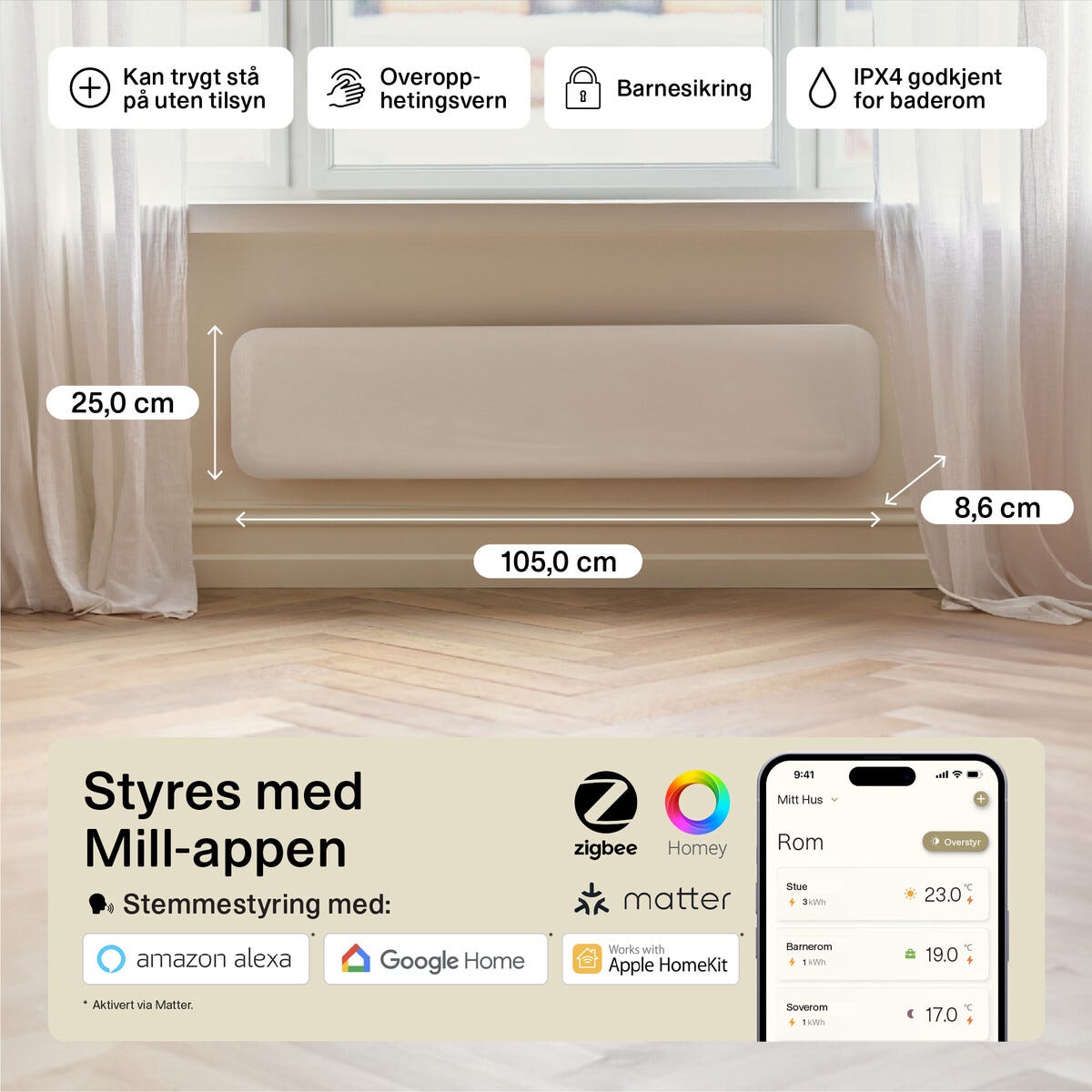 • Mill Invisible Gen. 4 – smart panelovn med minimalistisk design (850 W).
