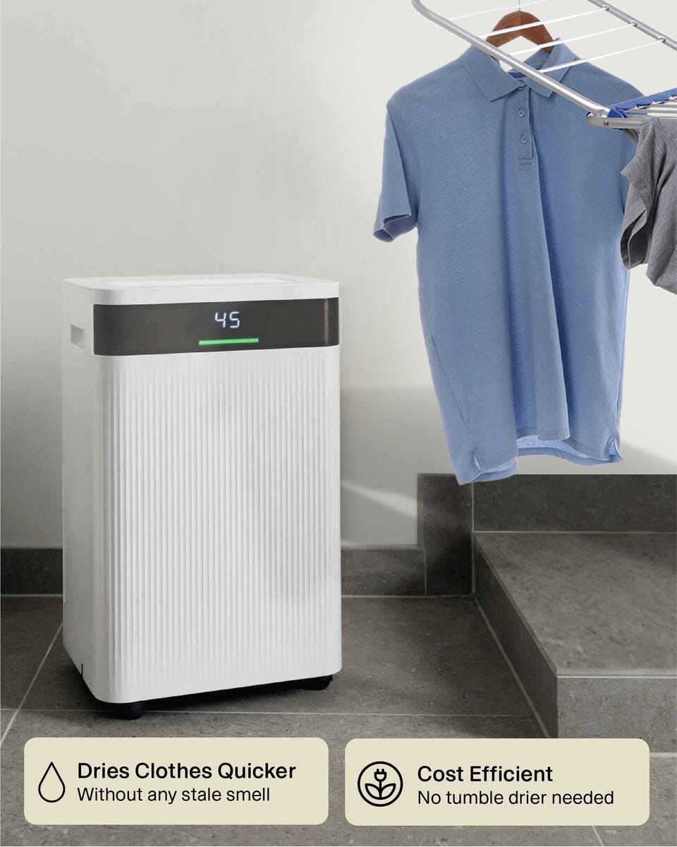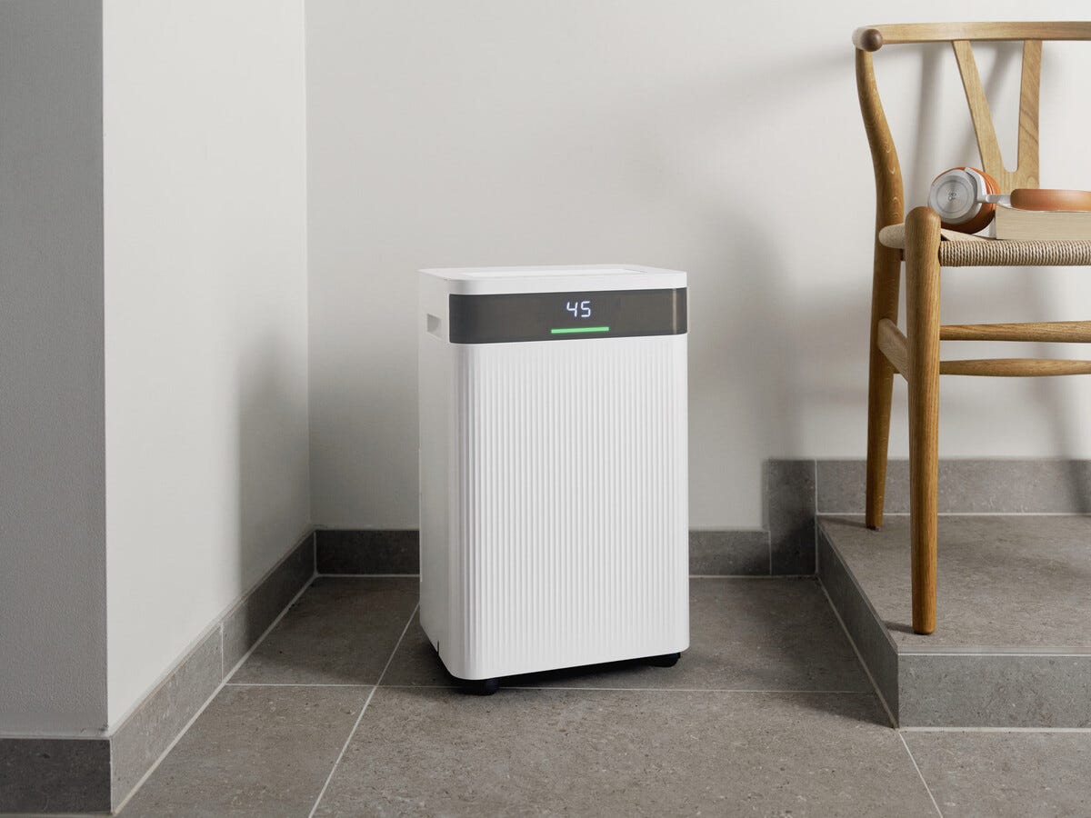 • Fjerner opptil 20 liter fukt per døgn – effektiv i kjeller og vaskerom.