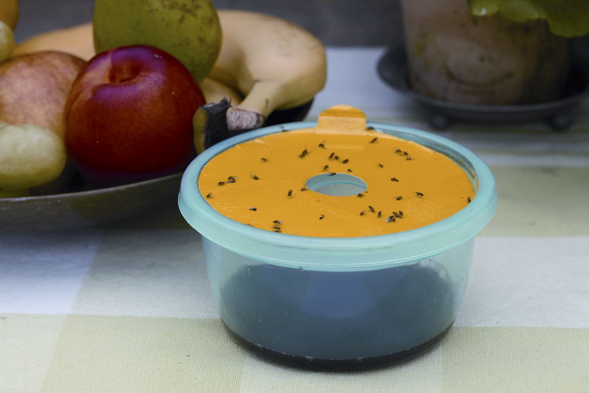 • Et klebrig ark med lim gjør at fruktfluene setter seg fast på fellens lokk.