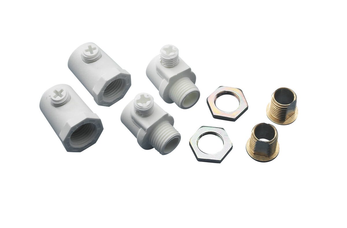 • Inneholder: 4 stk. strekkavlastninger med låseskrue (2 med innvendige gjenger og 2 med utvendige), 2 stk. sekskantmuttere og 2 stk. flensnipler i messing.