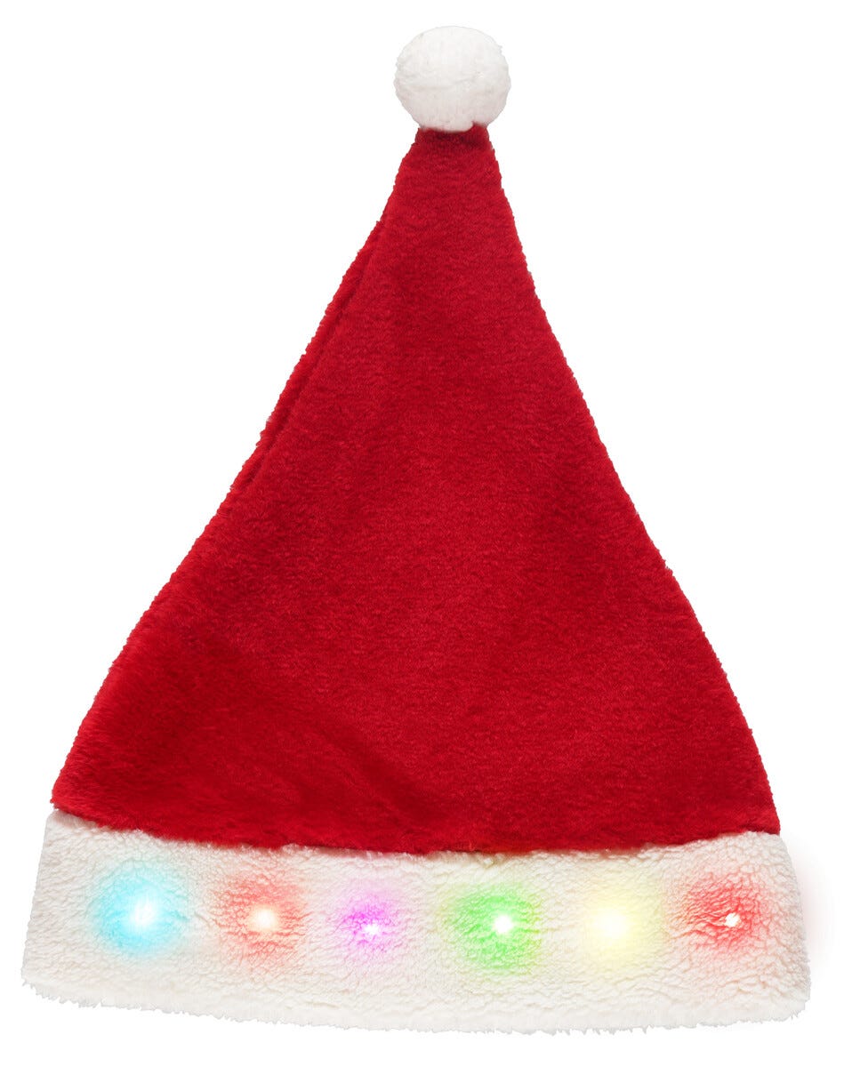 • Myk nisselue i dyp rød farge med hvit kant og blinkende LED-belysning.
