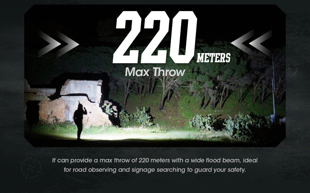 • Flat lommelykt med rekkevidde på opptil 220 meter.