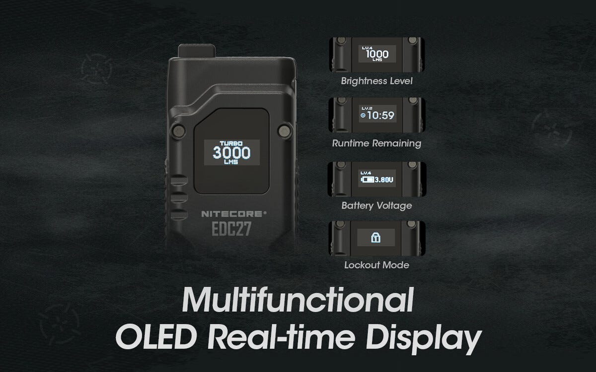 • Tydelig OLED-display som viser lysstyrke, batterinivå og brukstid.
