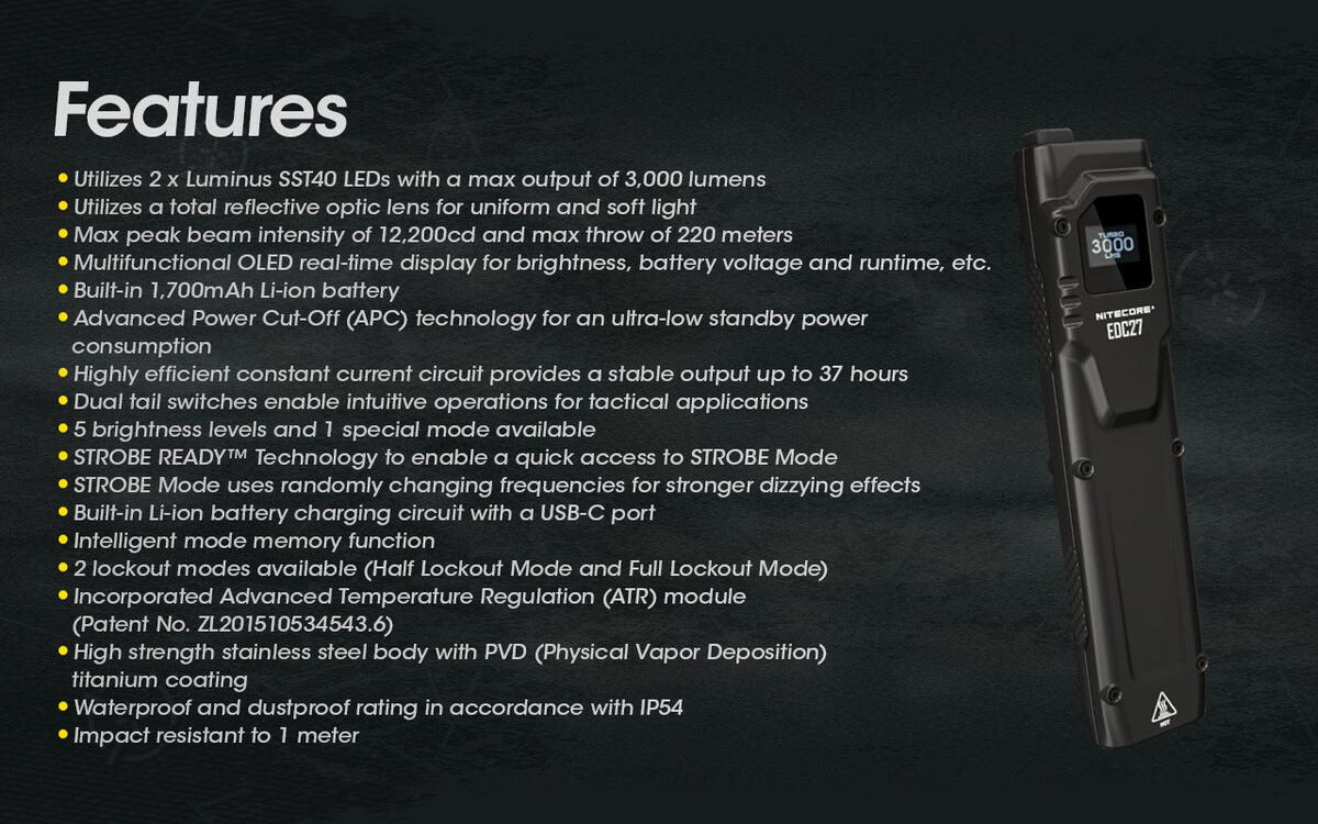 • Nitecore 3000 lm oppladbar lommelykt LED med USB-C (ladekabel er inkludert).