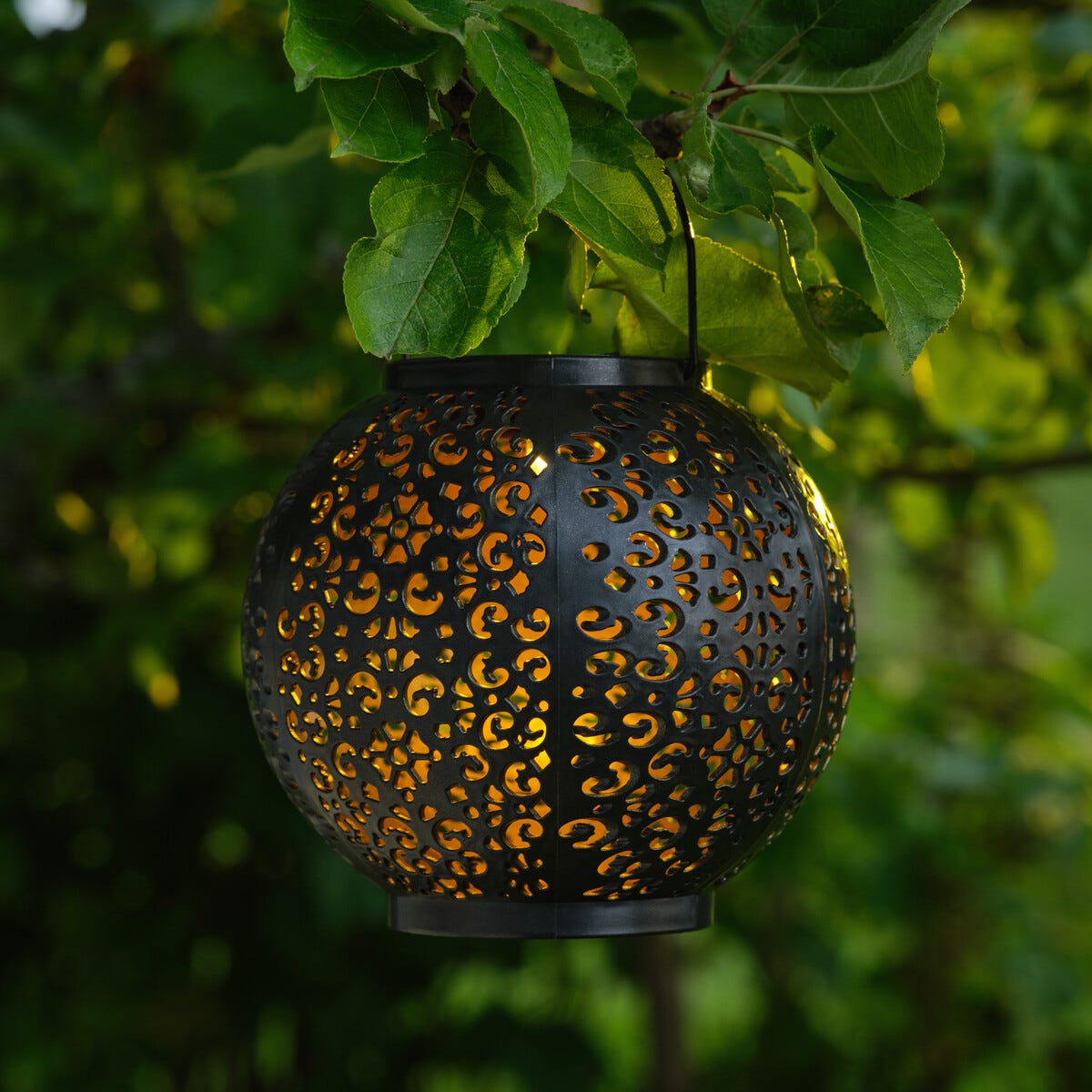 • Svart solcellelykt med varmhvitt lys, gyllen innside og dekorative hull.