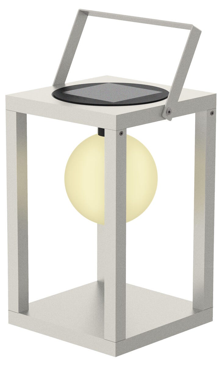 • Varmgrå solcellelykt i minimalistisk design med hank og stor lyspære med varmhvitt lys.