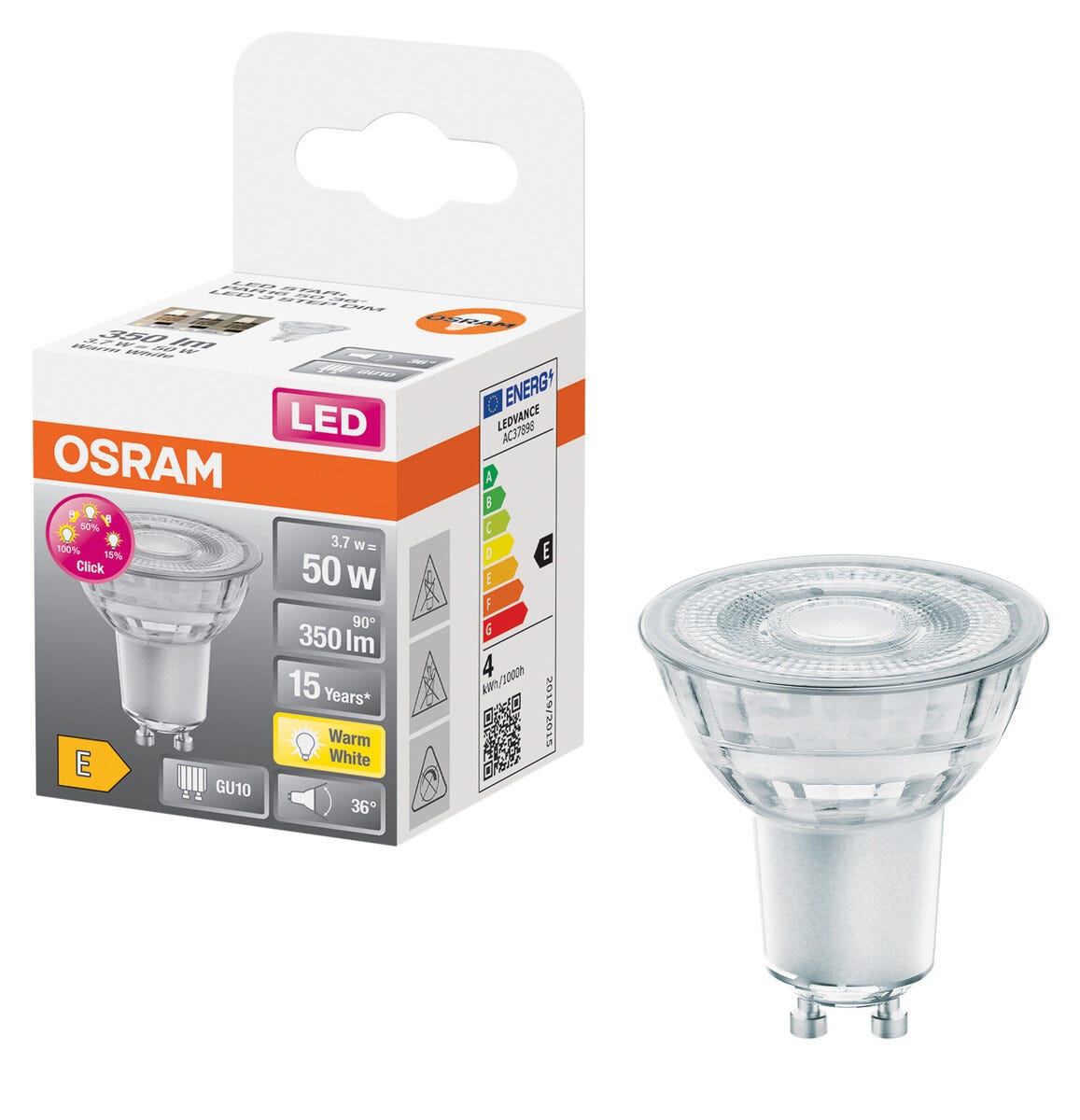 • Varmhvit LED-pære GU10 med 3-trinns dimmer – velg mellom 100 %, 50 % eller 15 % styrke.