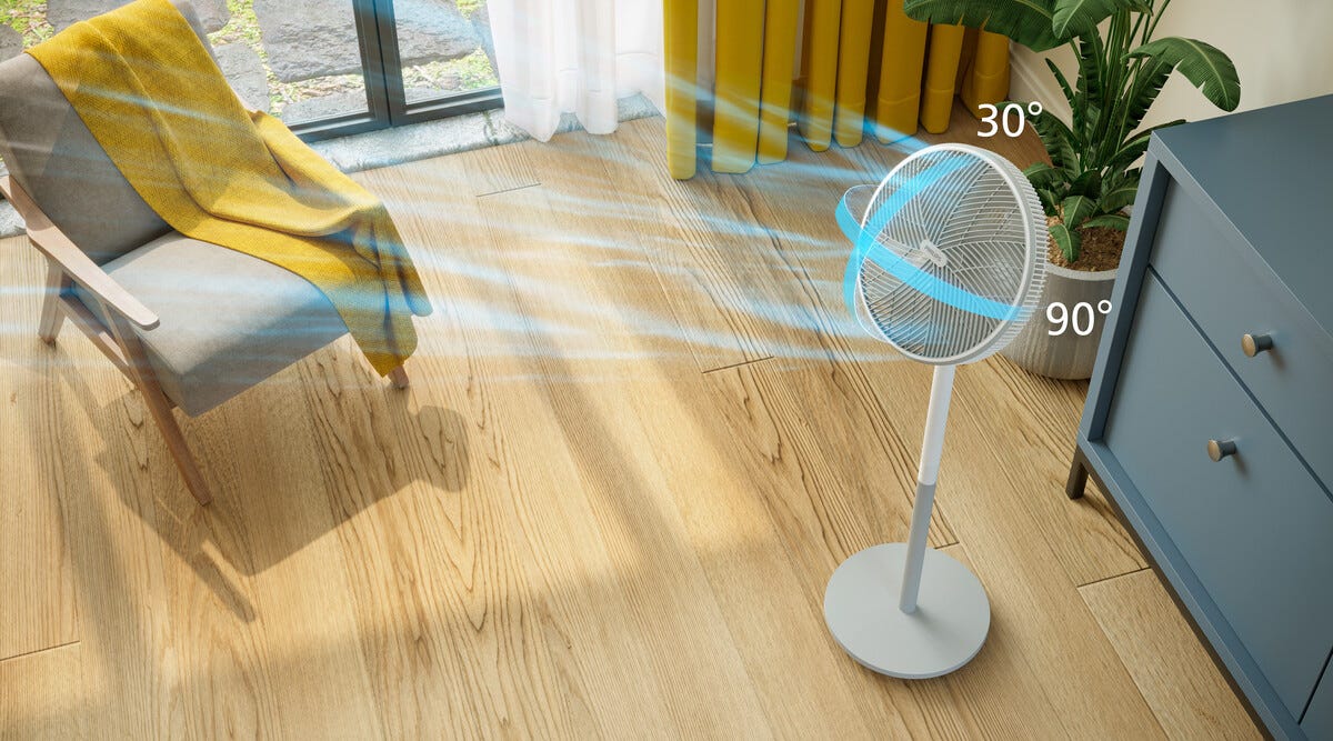 • Stillegående gulvvifte (19 dB(A)), 3 hastigheter, nattmodus og naturlig bris-modus.