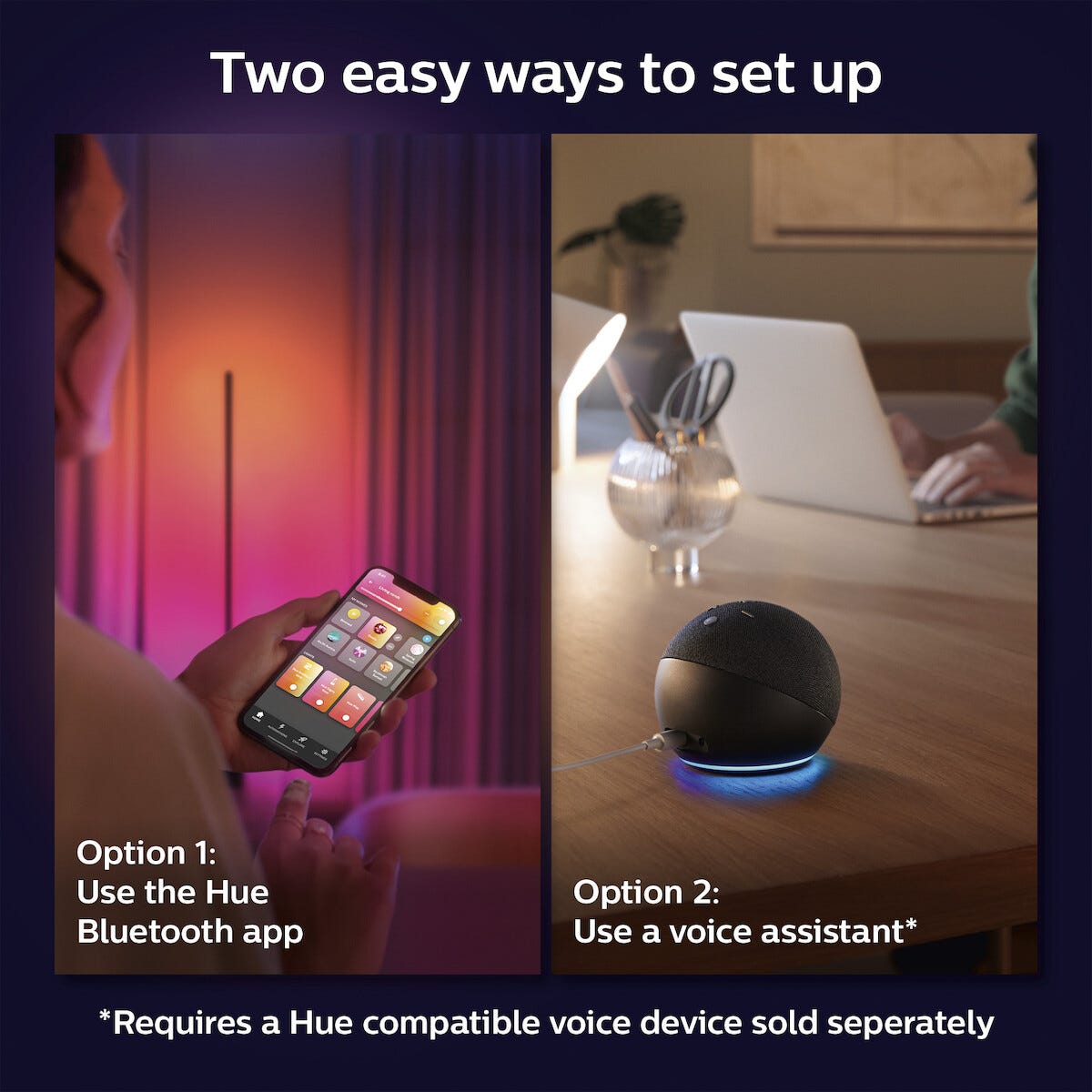• Styr via Bluetooth, stemmestyring eller Hue Bridge for å få flere smarte funksjoner.