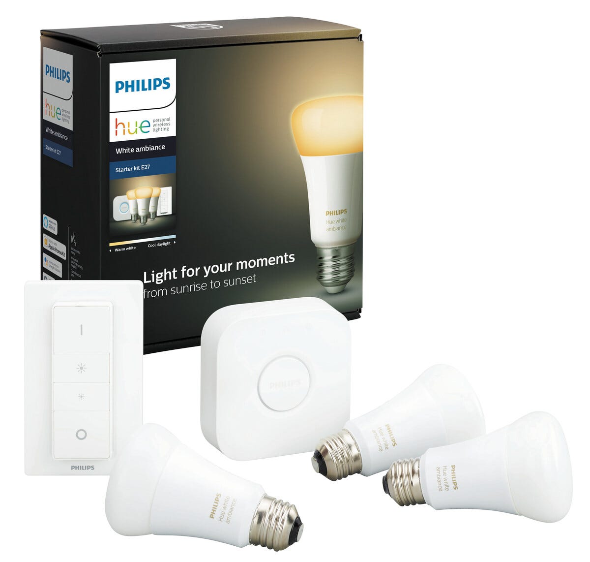 Philips Hue White Ambiance startsett med Hue Bridge, LED-pærer og dimmere