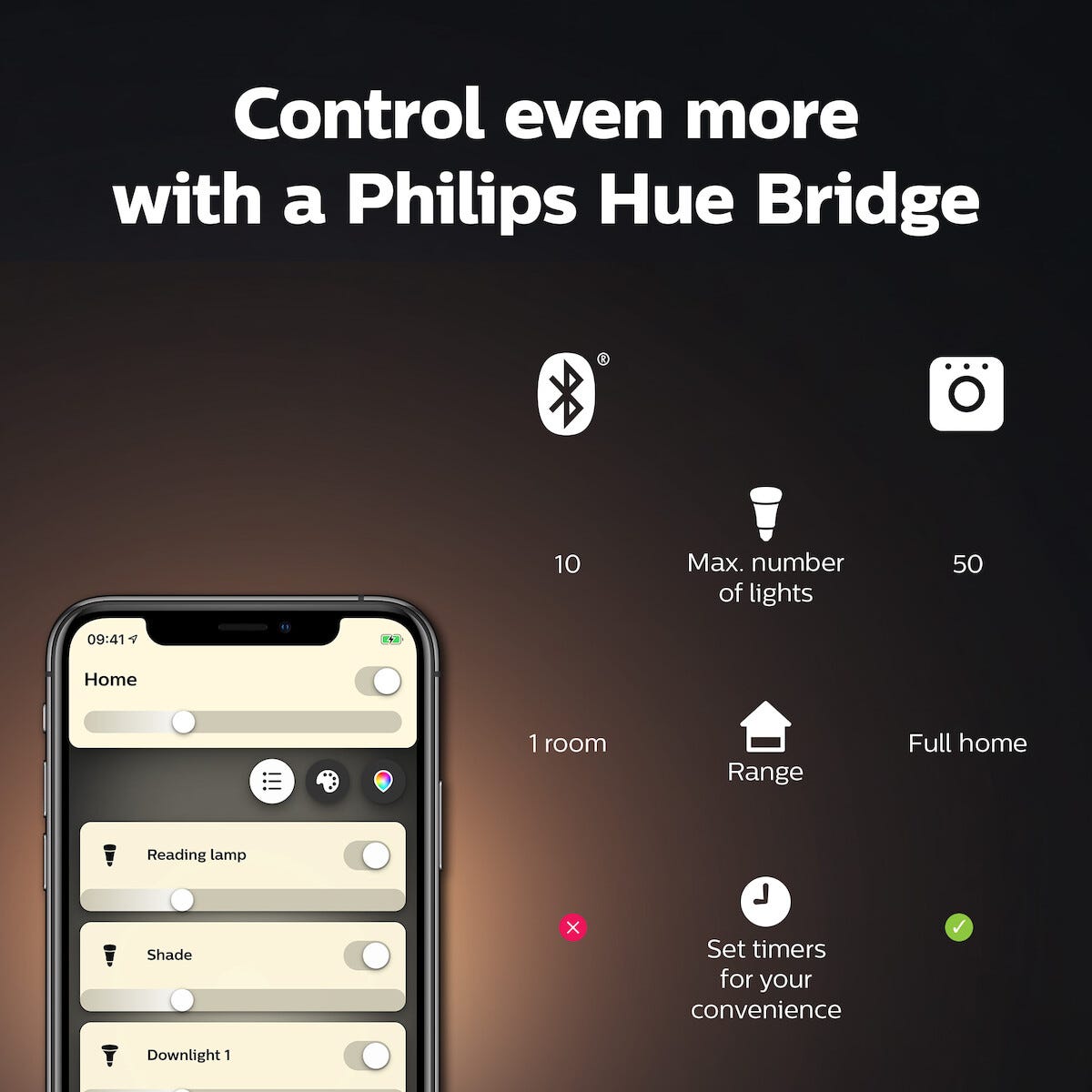 • Styr via Bluetooth, stemmestyring eller Hue Bridge for flere smarte funksjoner.