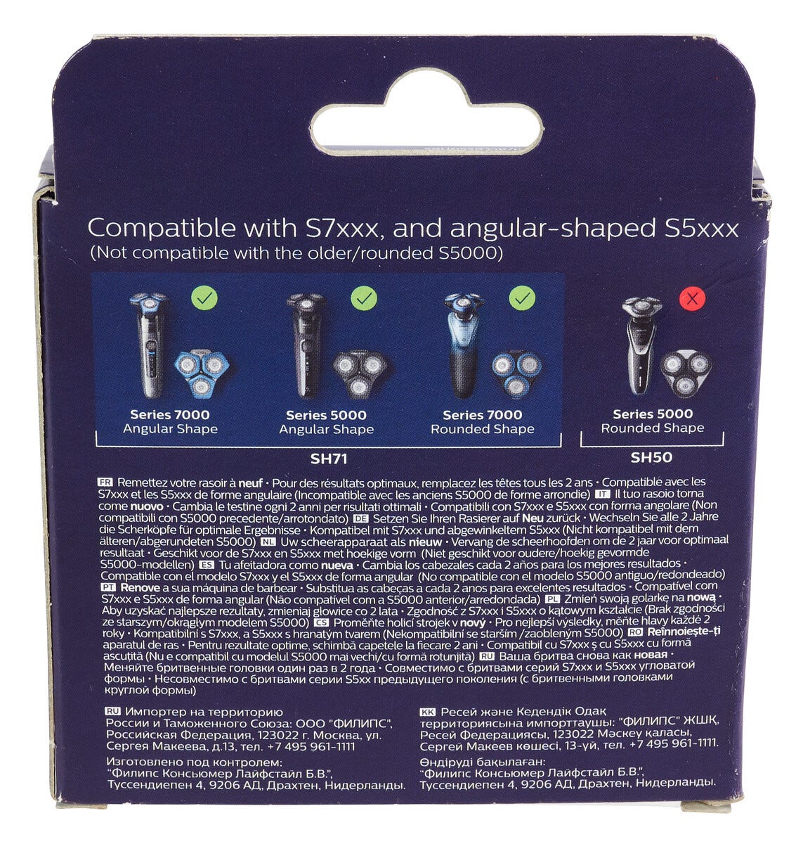 SH71-skjærehode er kompatible med alle barbermaskiner i 7000-serien (S7xxx) og vinkelformede barbermaskiner i 5000-serien (S5xxx). De er ikke kompatible med avrundede barbermaskiner i 5000-serien, som i stedet bruker SH50-erstatningshoder.