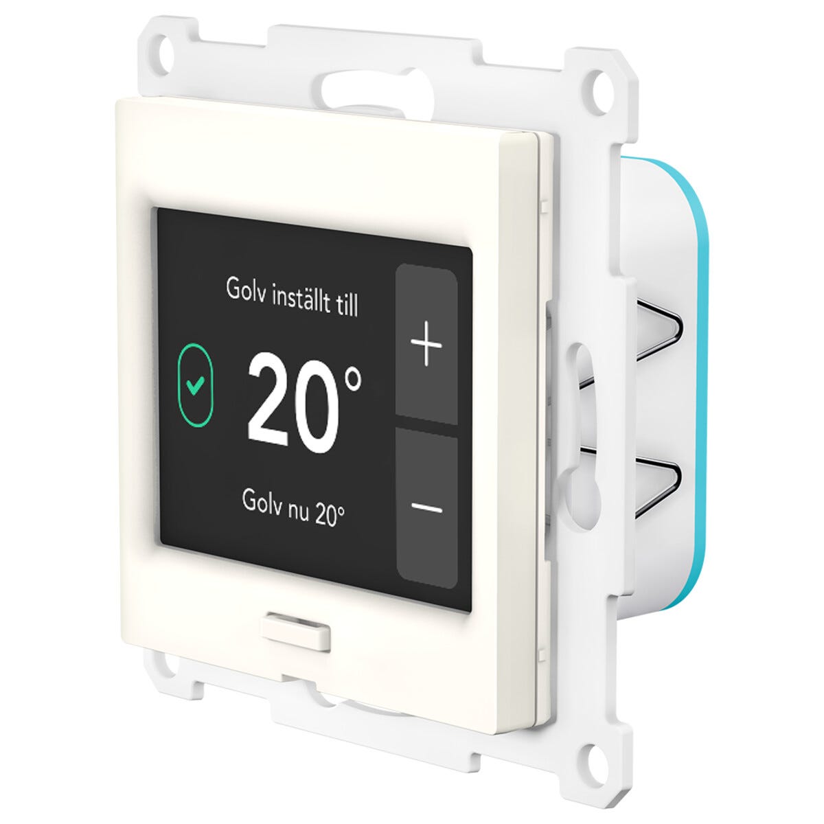 • Hvit gulvvarmetermostat med innebygd romføler – gulvføler medfølger.