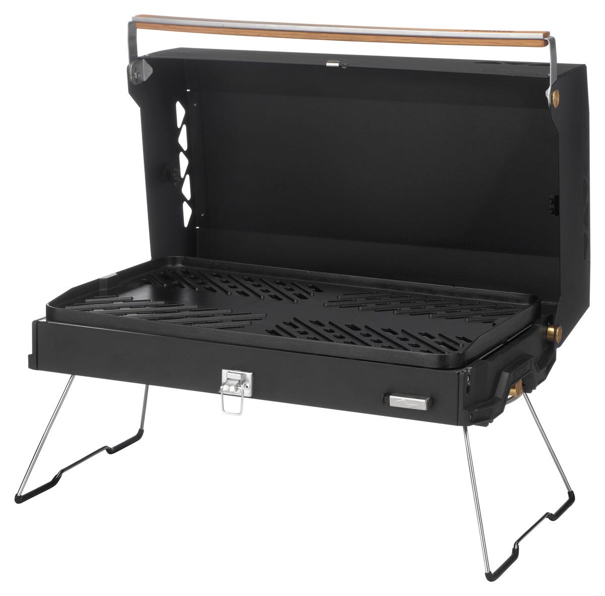 • Hendig, bærbar grill med utfellbare ben og bordplass.
