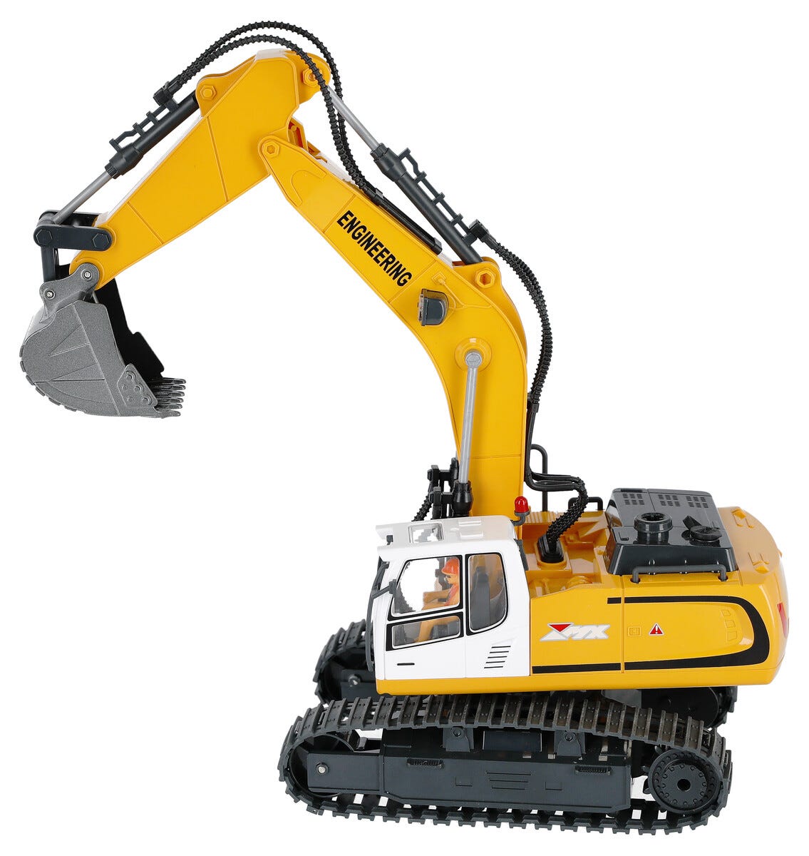 • Realistisk radiostyrt gravemaskin med bevegelig skuffe og roterbar førerhytte.