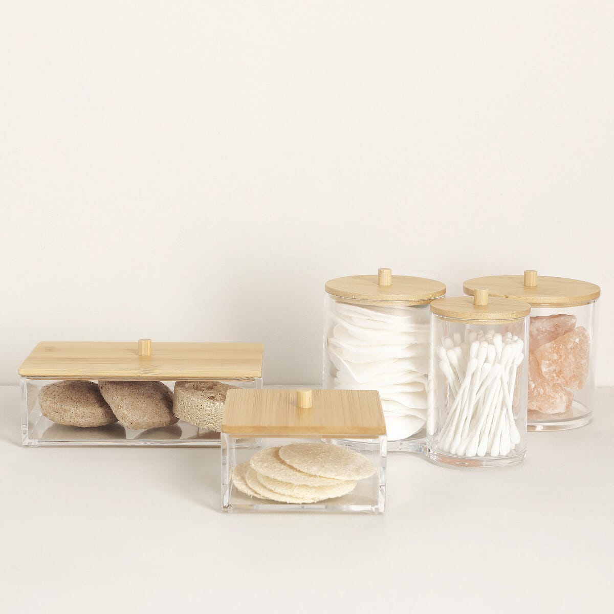 • Runde, gjennomsiktige bokser med bambuslokk.