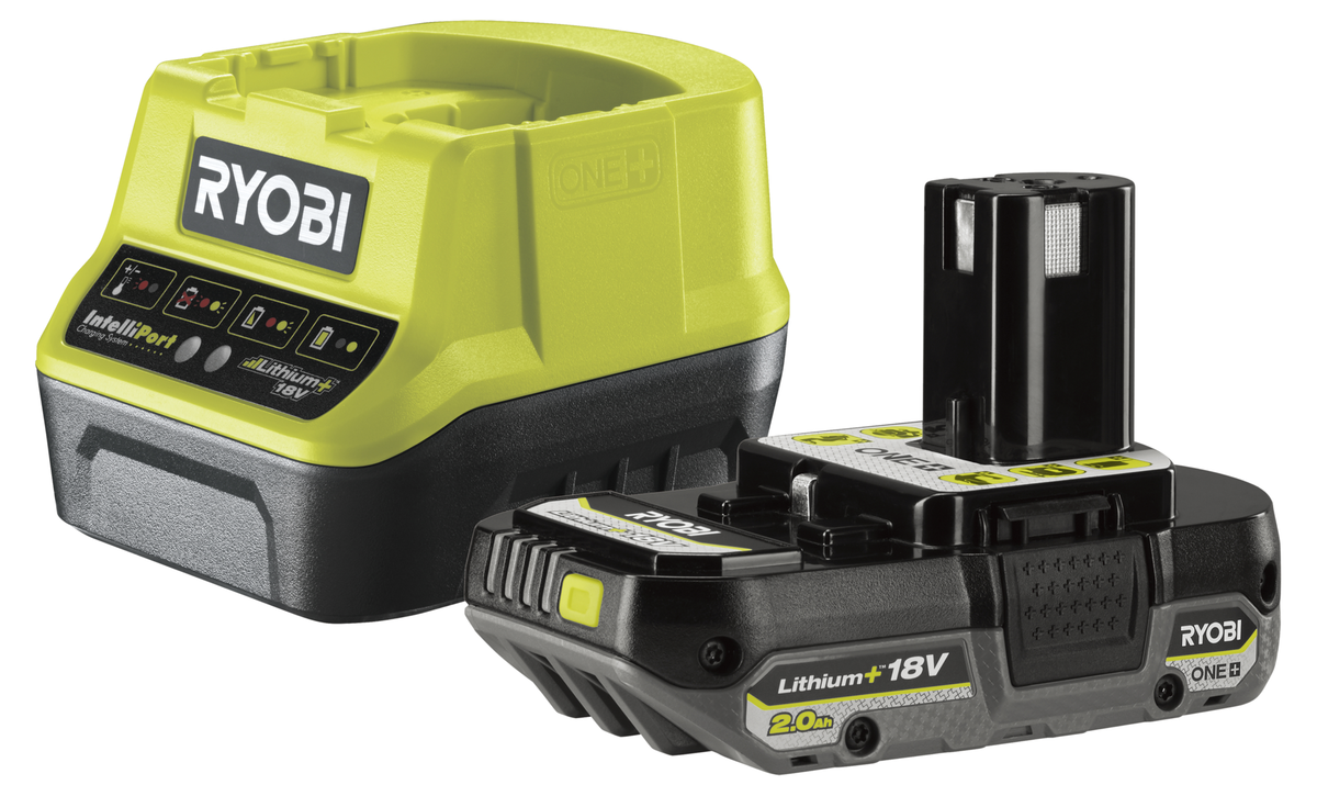 • Startsett til Ryobi One Plus elverktøy – 2,0 Ah-batteri og batterilader.