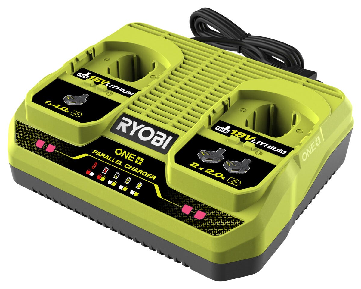 • Ryobi RC18240 lader med to porter, intelligent ladeteknologi og vedlikeholdslading.