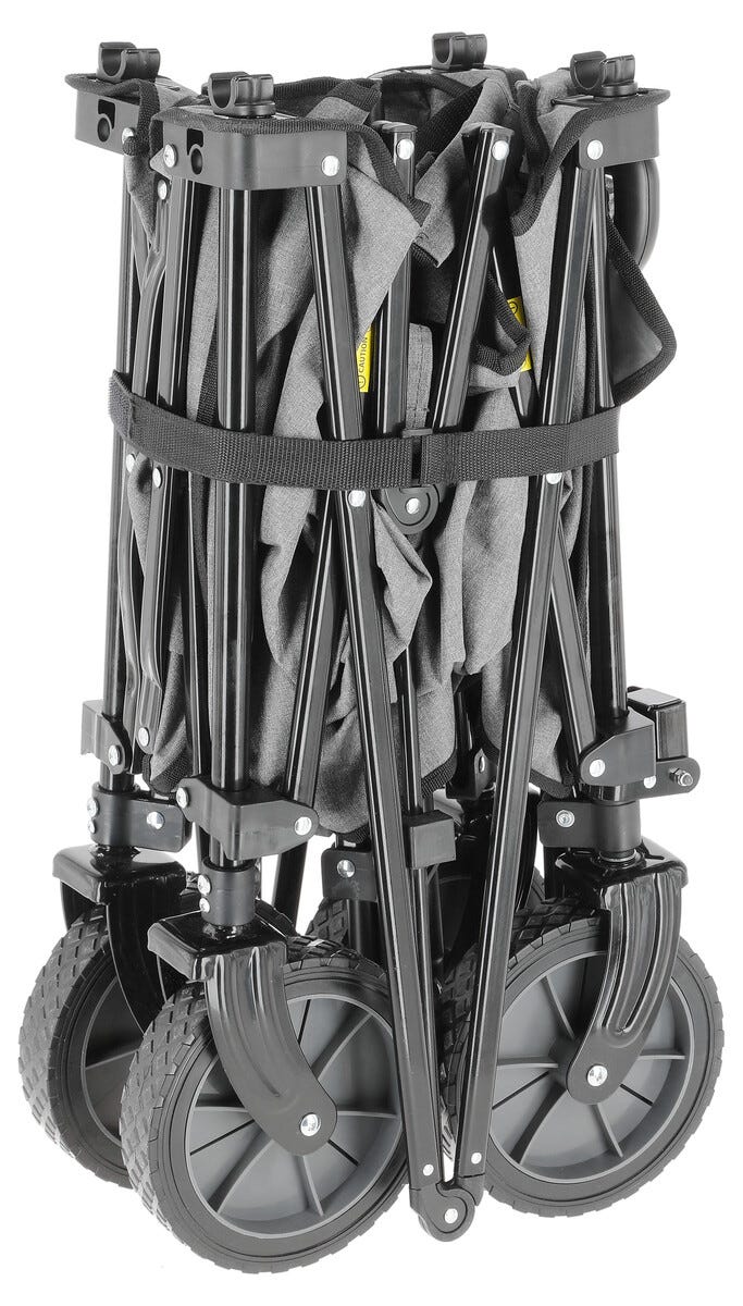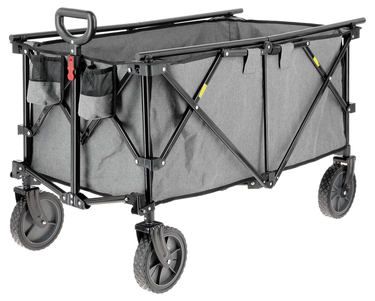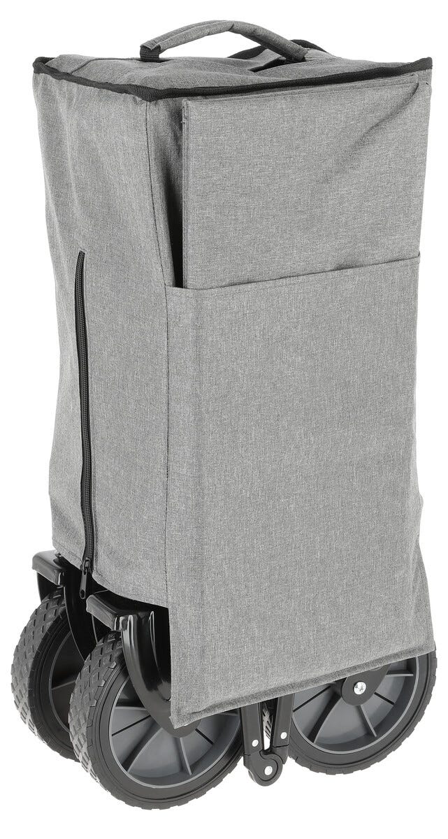 • Sammenleggbar transportvogn med store hjul og teleskophåndtak.