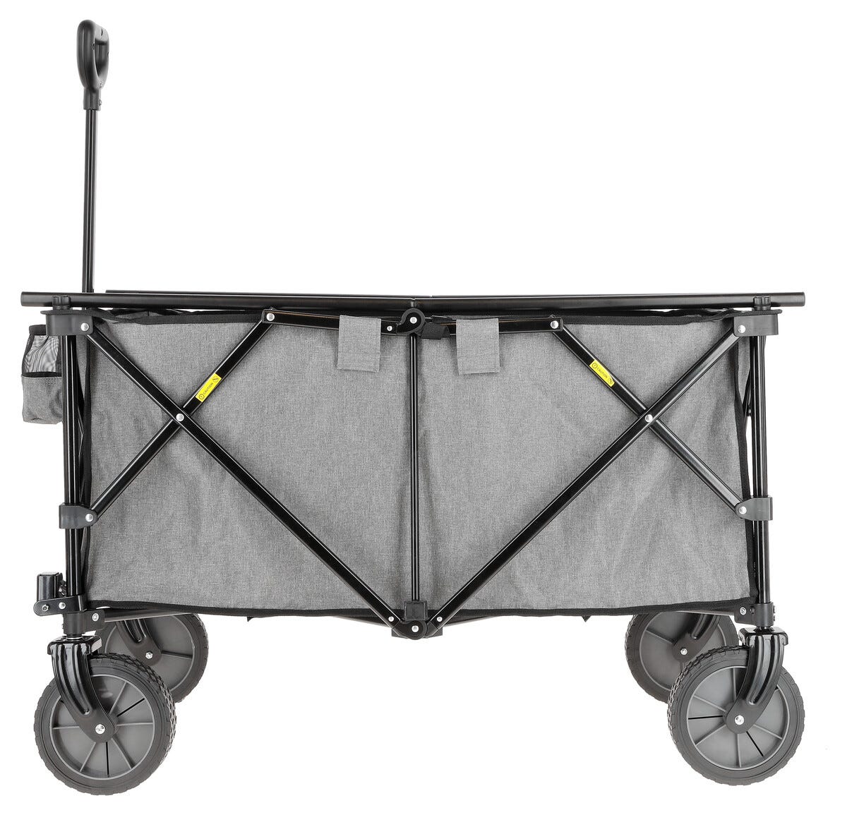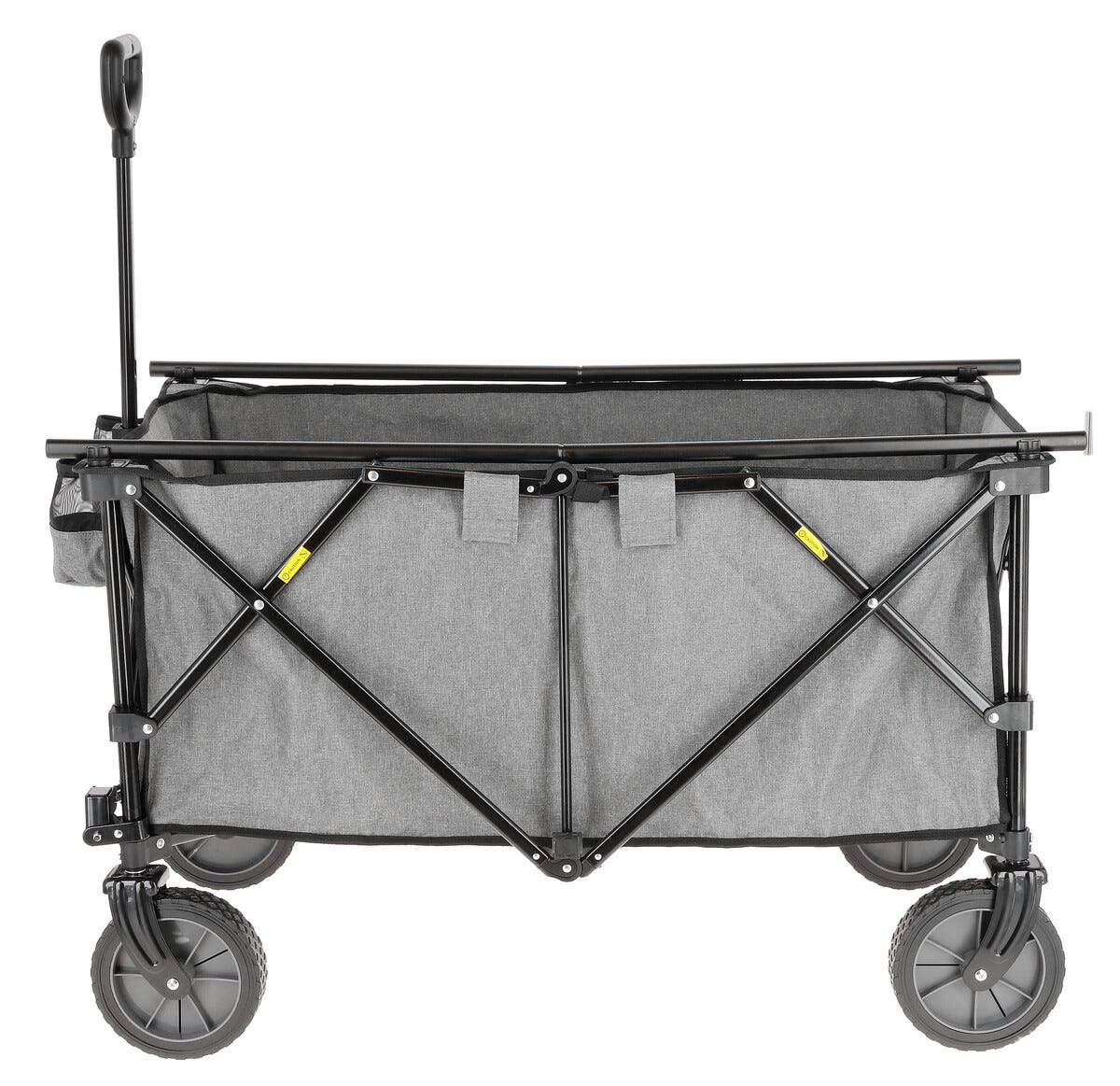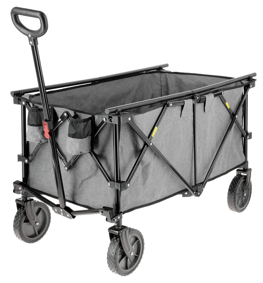 • Sammenleggbar transportvogn med store hjul og teleskophåndtak.