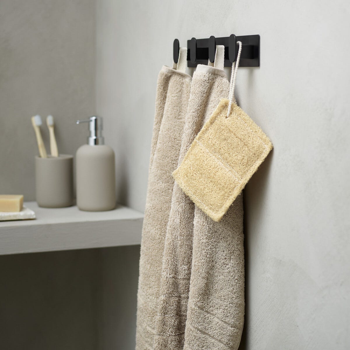 • Praktisk håndkleholder – formen hindrer at håndklærne glir av.