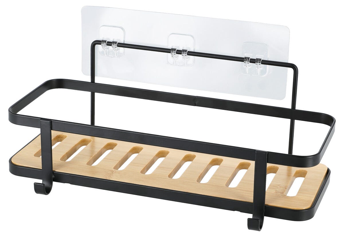 • Selvklebende baderomshylle i bambus og svartlakkert stål.