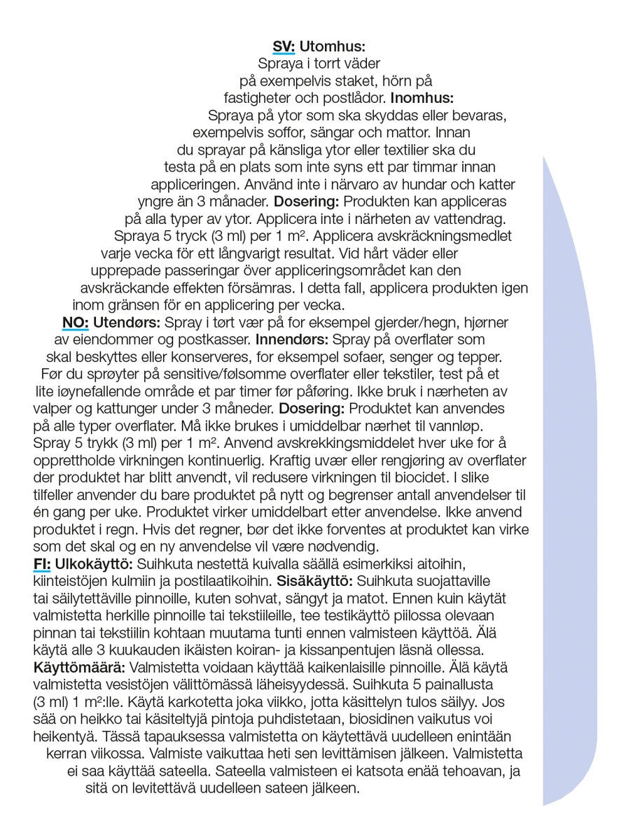 • Effektiv avskrekkingsspray – beskytter mot revirmarkering både inne og ute.