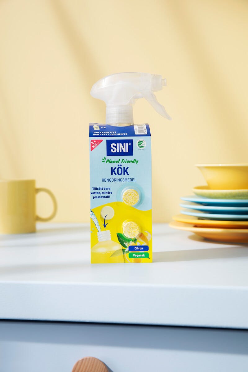 • Sini startpakke for kjøkken – sprayflaske og 2 rengjøringstabletter medfølger.