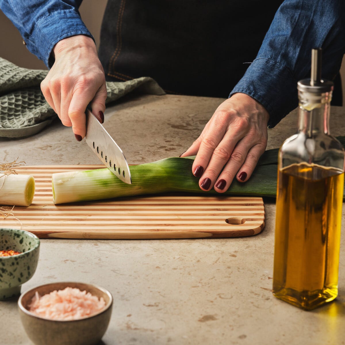 • Stilrent skjærebrett i bambus som tåler daglig bruk. Skånsom mot knivene.