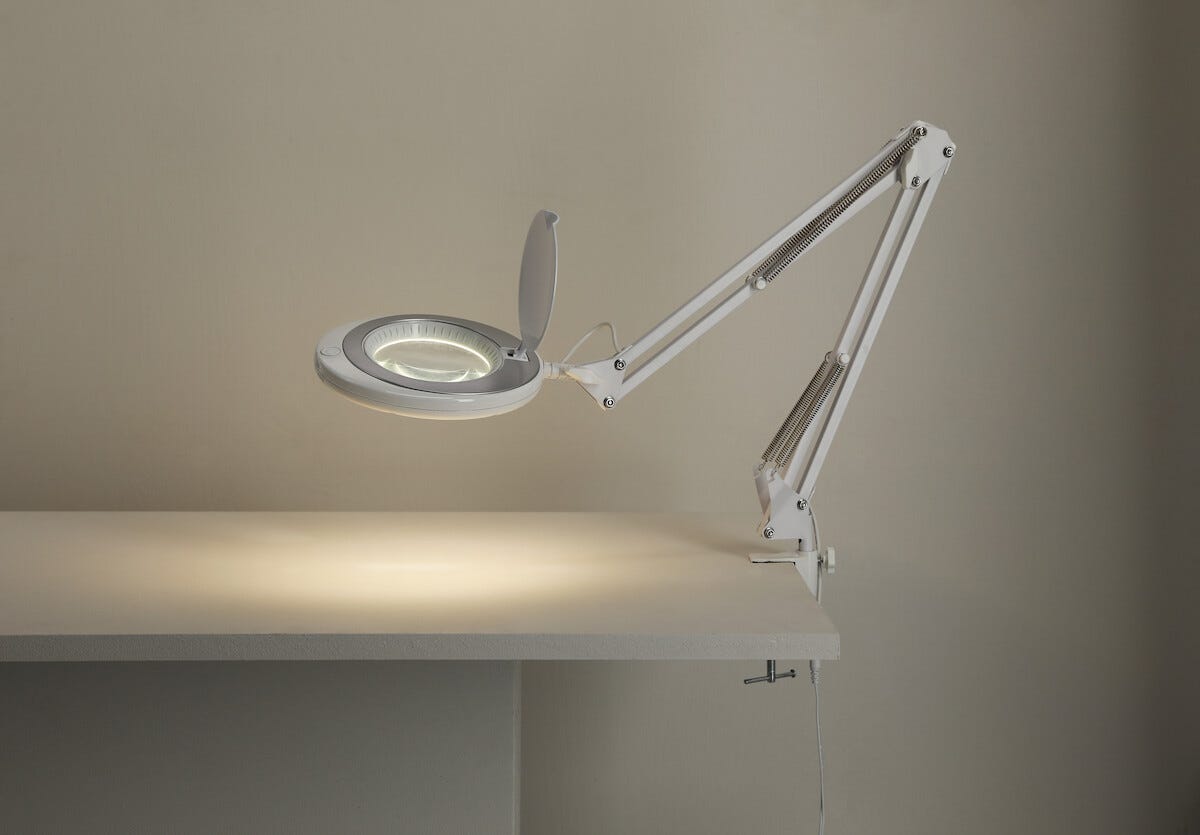 • Skrivebordslampe med LED og et stort, tydelig innebygget forstørrelsesglass.