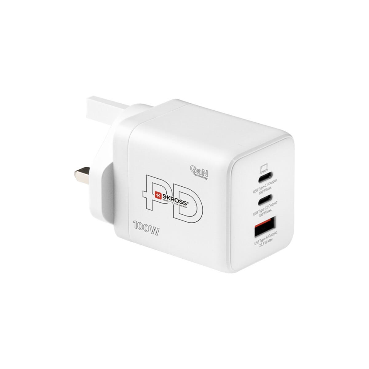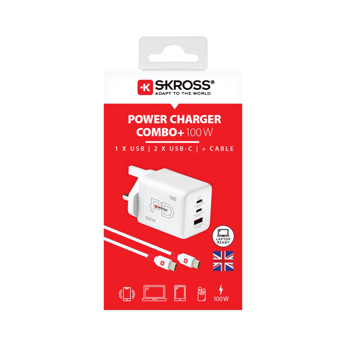 • Skross Combo+ 100 W PD UK kompakt GaN-lader for reise og hverdagsbruk.
