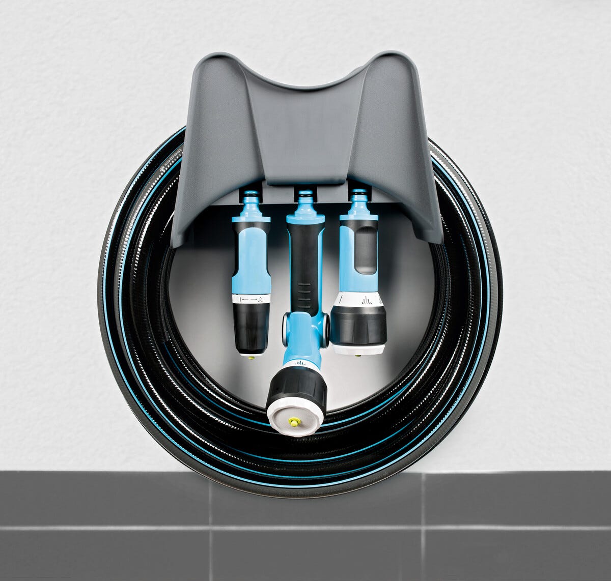Slangeholder til vannslange med rom til tilbehør, plast