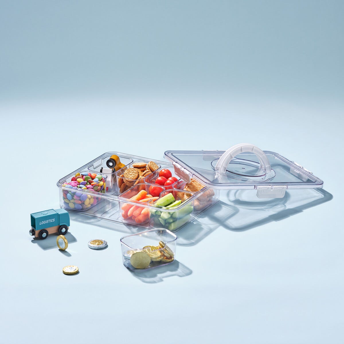 Snacksboks med 8 rom og bærehåndtak