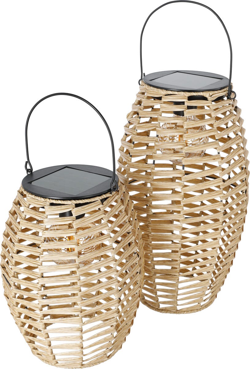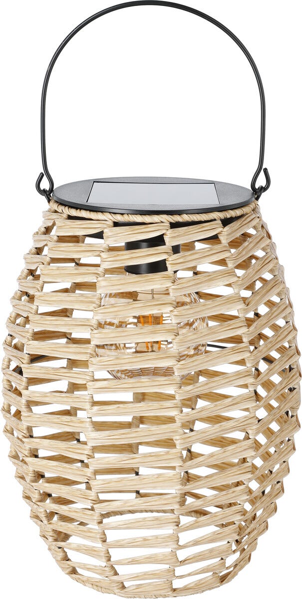 • Solcellelykt i kunstrotting med håndtak og integrert solpanel.