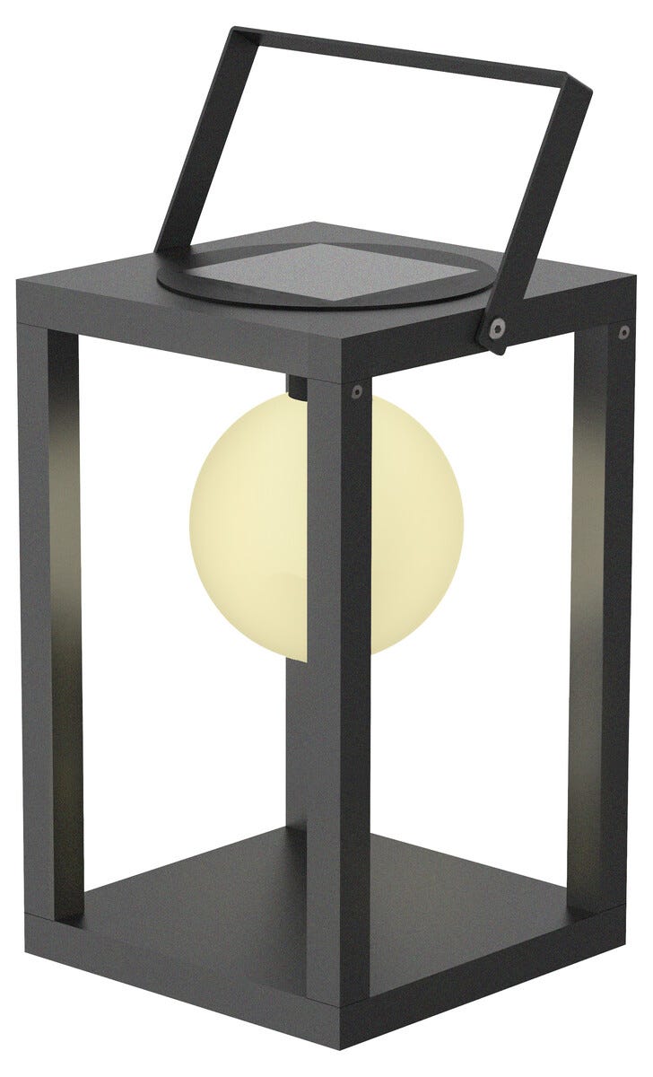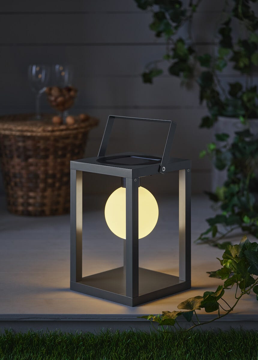 • Mørk grå solcellelykt med håndtak og stor lyspære med varmhvitt lys.