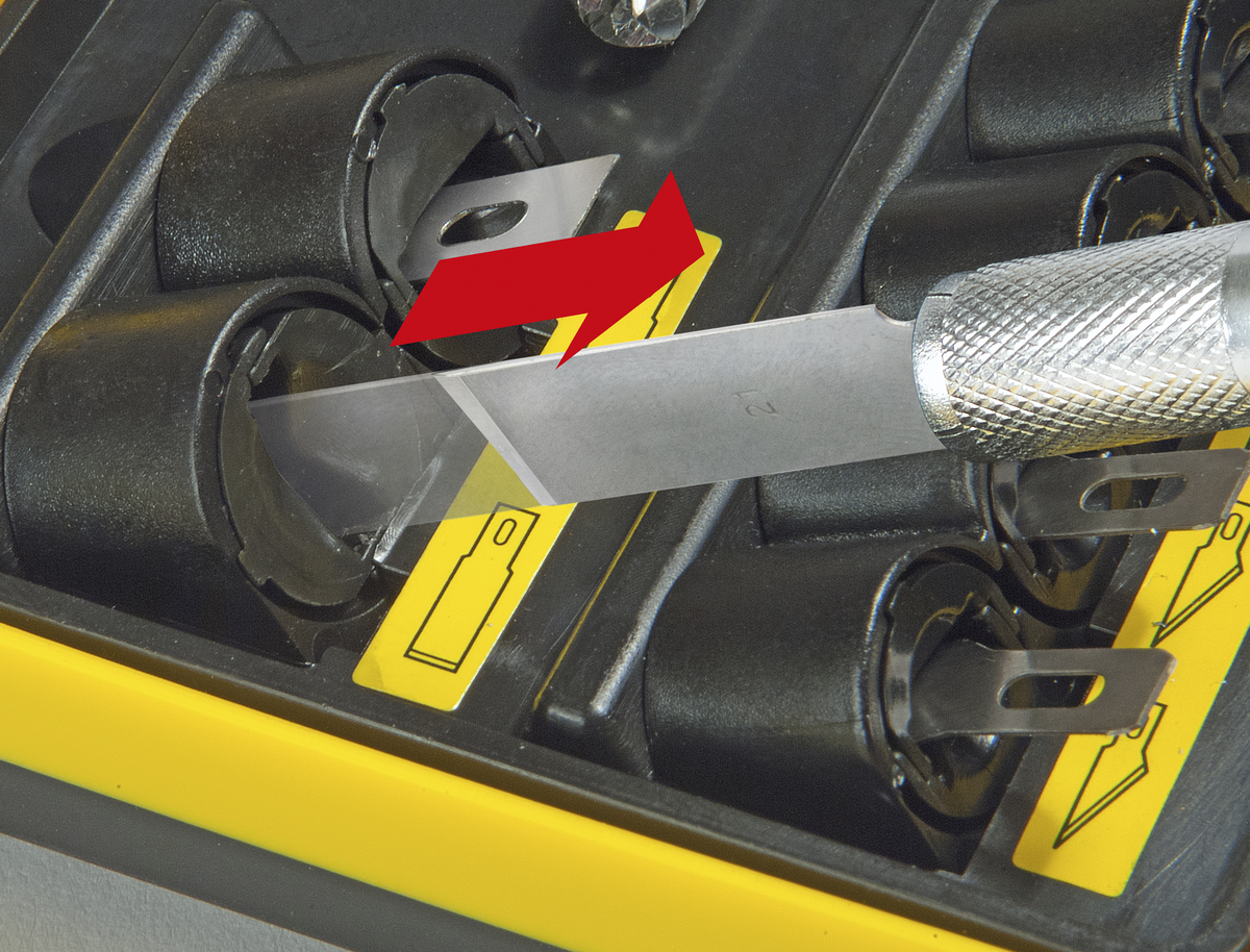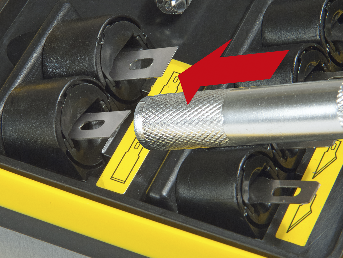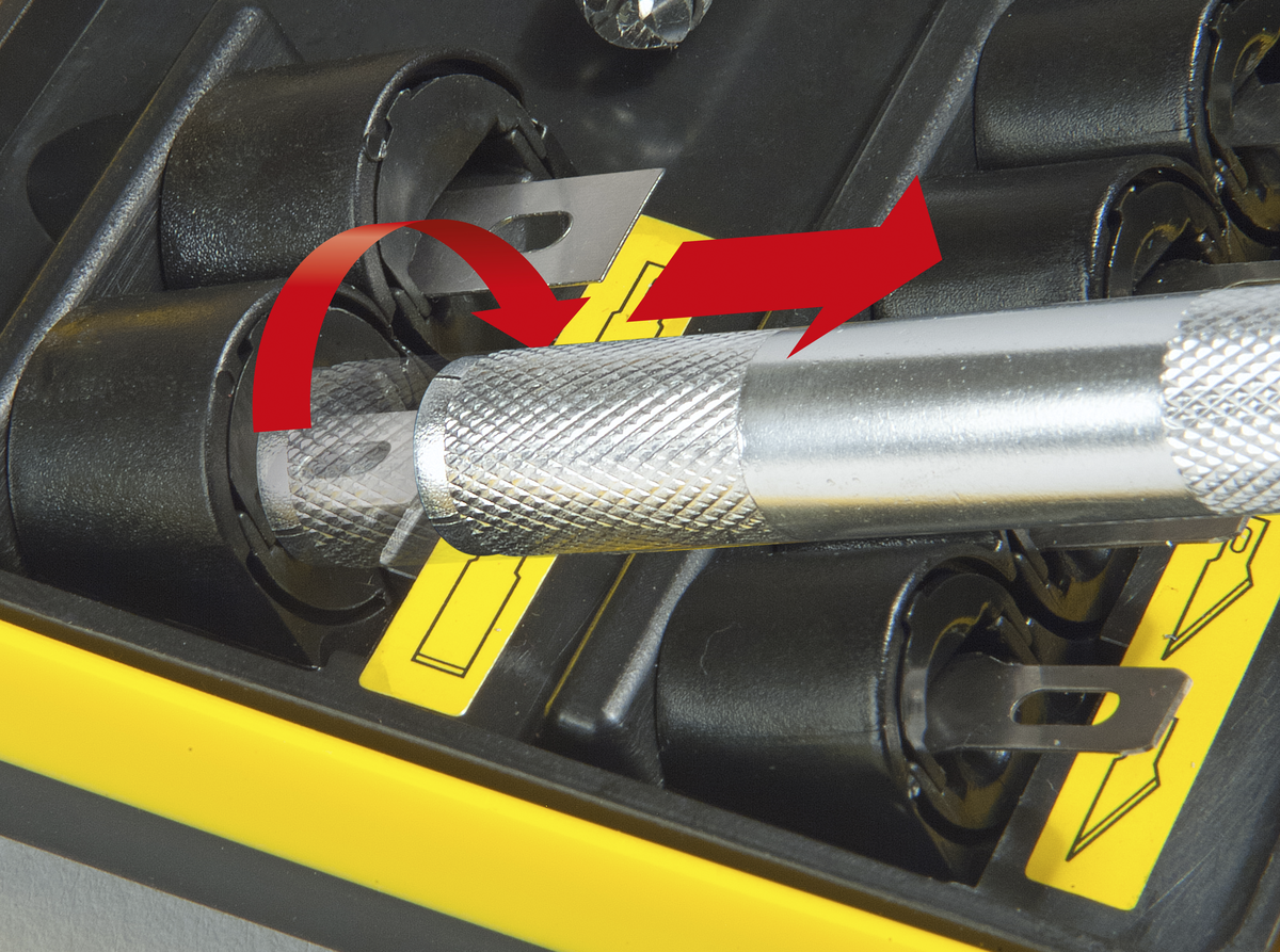 • No touch drahåndtak over knivbladet som roteres for å fjerne futteralet.