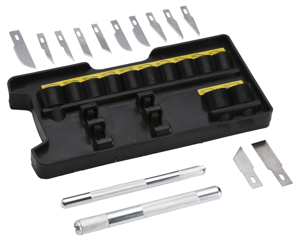• Stanley hobbyknivsett med to håndtak og mange blader.
