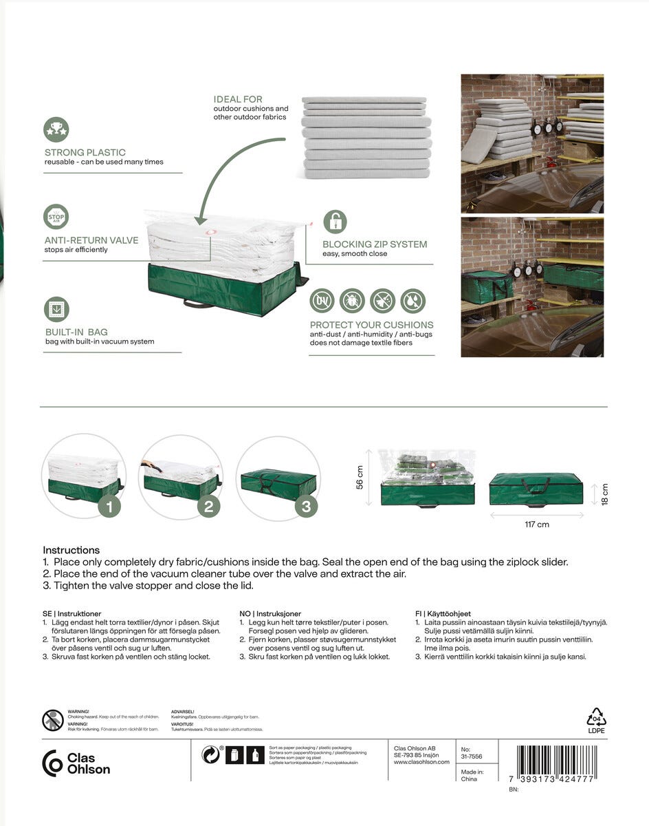 • Plassbesparende oppbevaring av sitteputer, utemøbelputer, skinnfeller og mer.