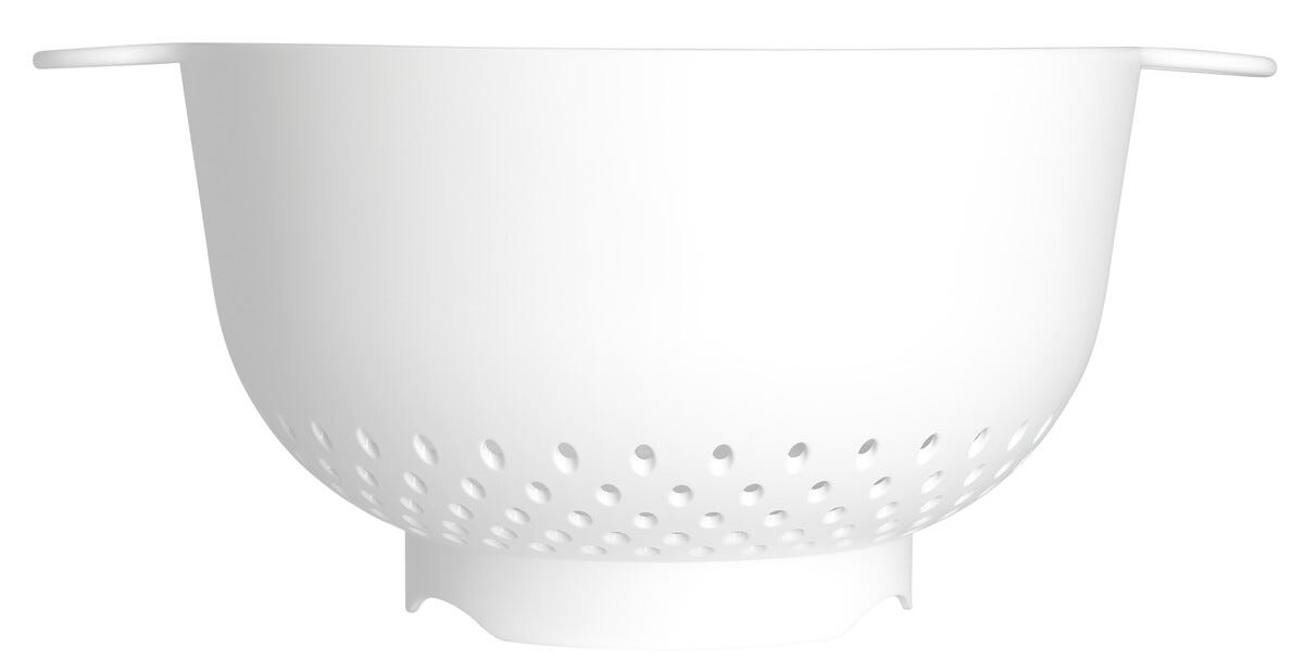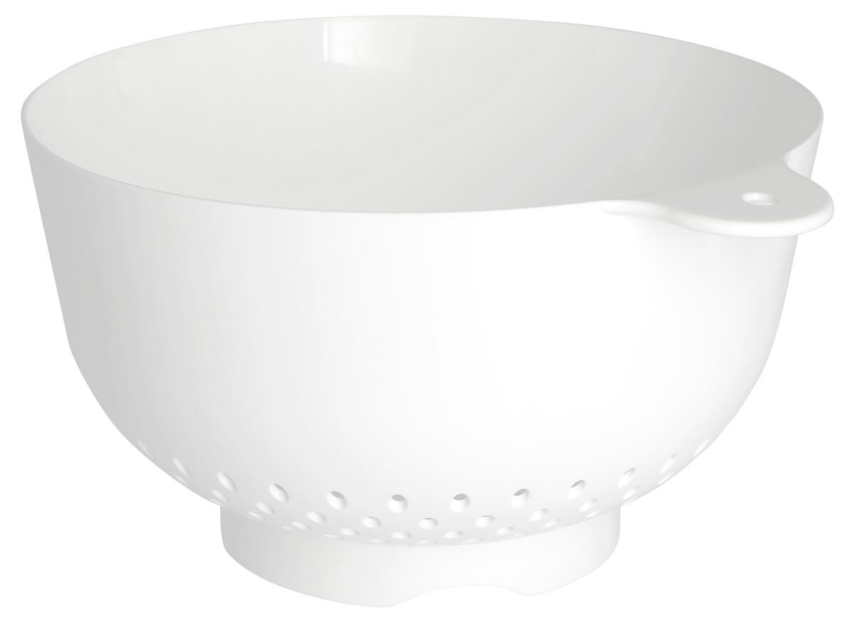 • Stort, hvitt dørslag i plast med 2 håndtak og fot.